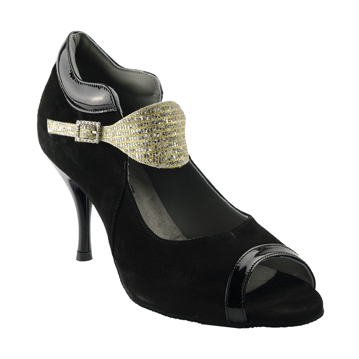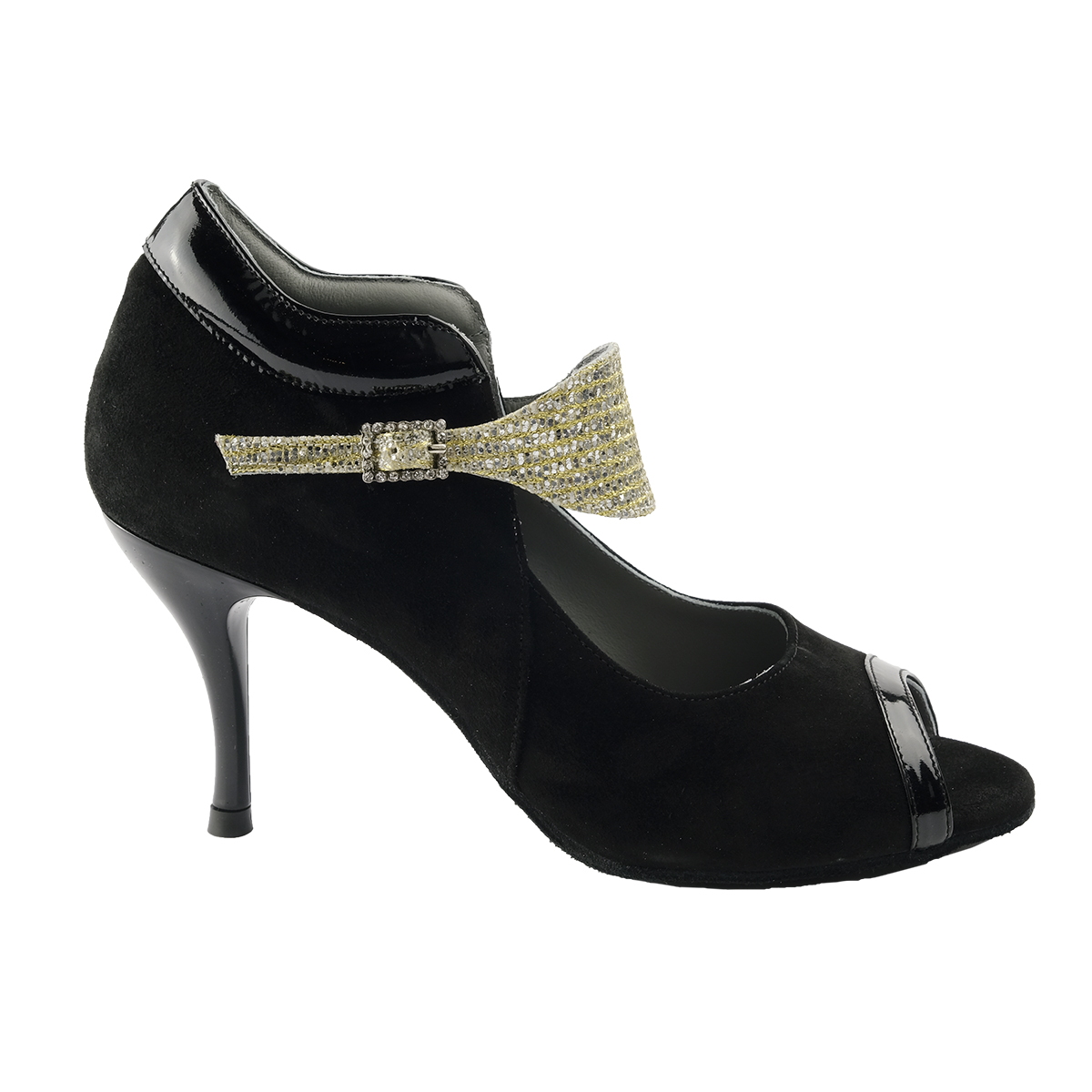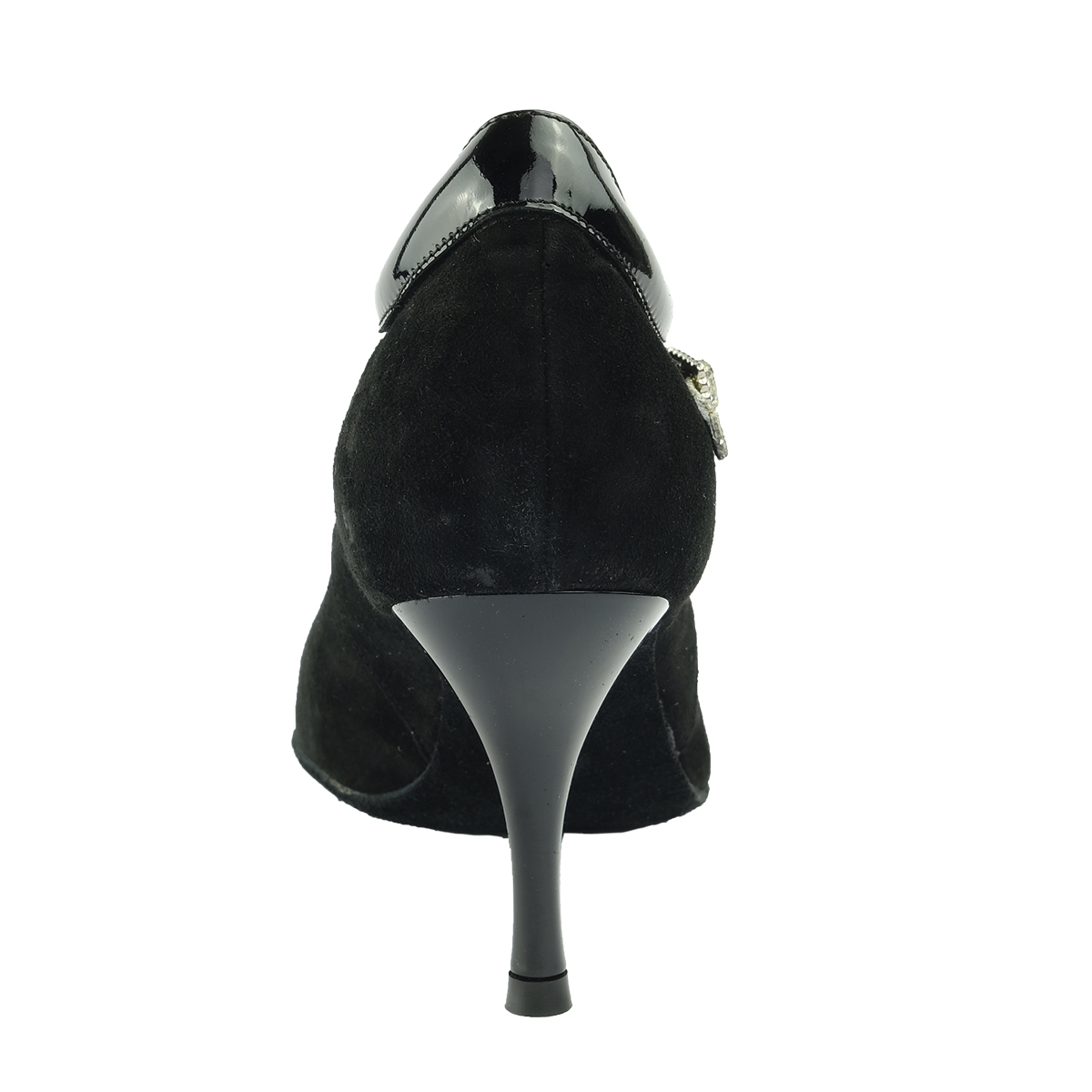 Extraordinary ladies dance shoe in the style of the 60s but with stiletto heel 80 mm in black suede, with a small lacquer detail and gloss material Excelsior. Well-foamed leather insole and non-slip suede dance sole. Dancers buy it for tango, kizomba and salsa, but also suitable for any dance course for the dance school if you prefer a high heel.
