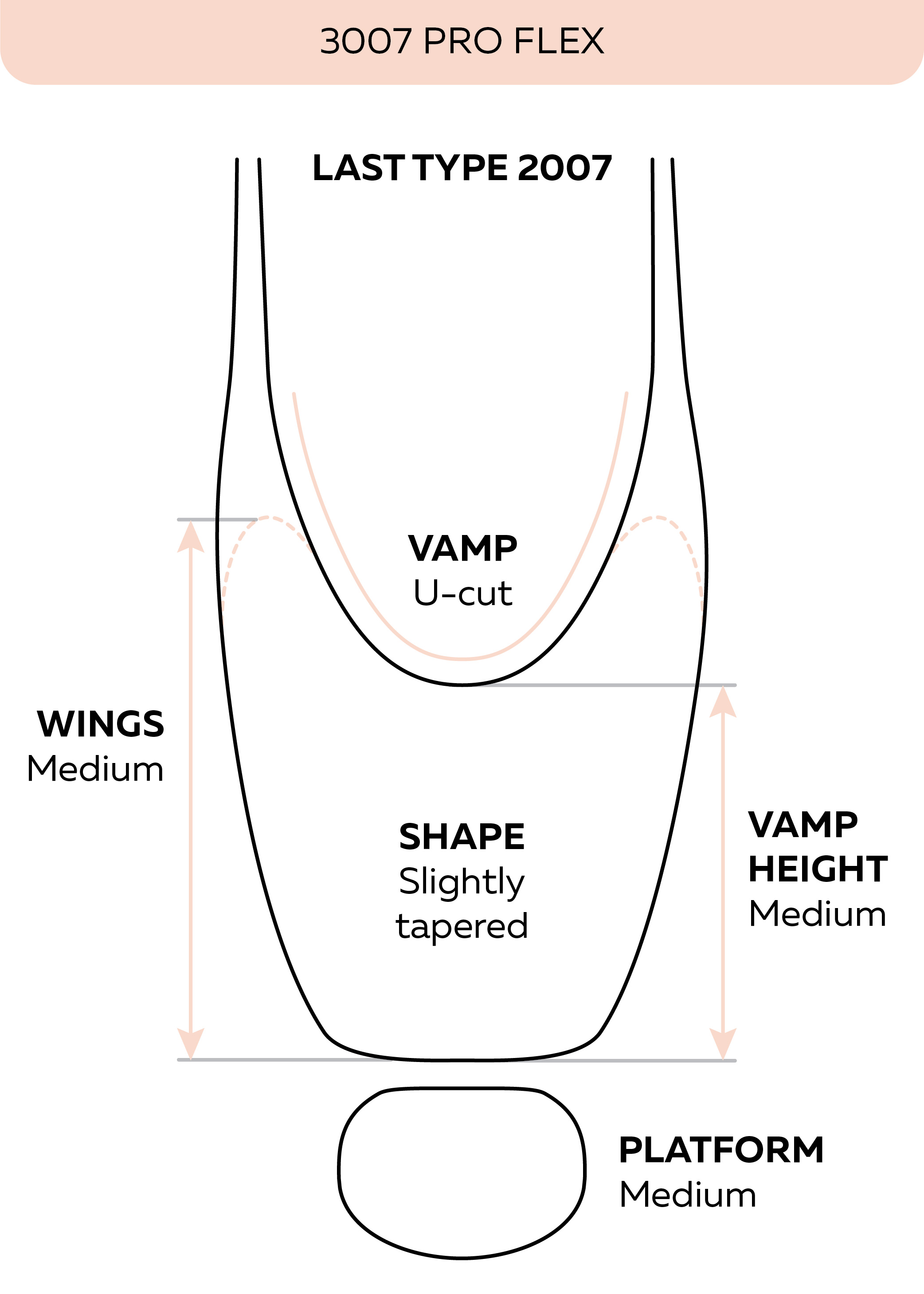 2007 is developed with consideration of anatomic features of the medium width foot with a medium arch with medium or long toes. This unique construction satisfies 90% of ballerinas. Therefore, Grishko has the biggest part of their pointe shoe models based on the 2007 last. 2007 has a tapered dynamic form.