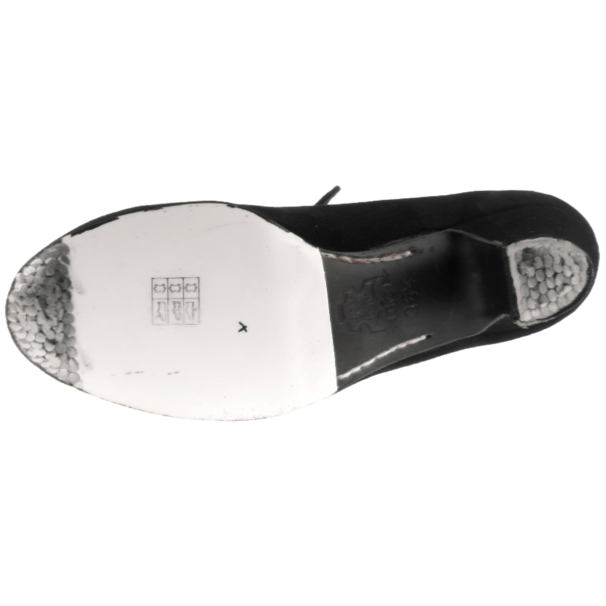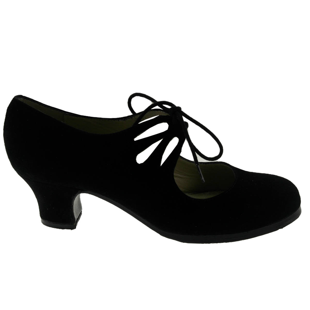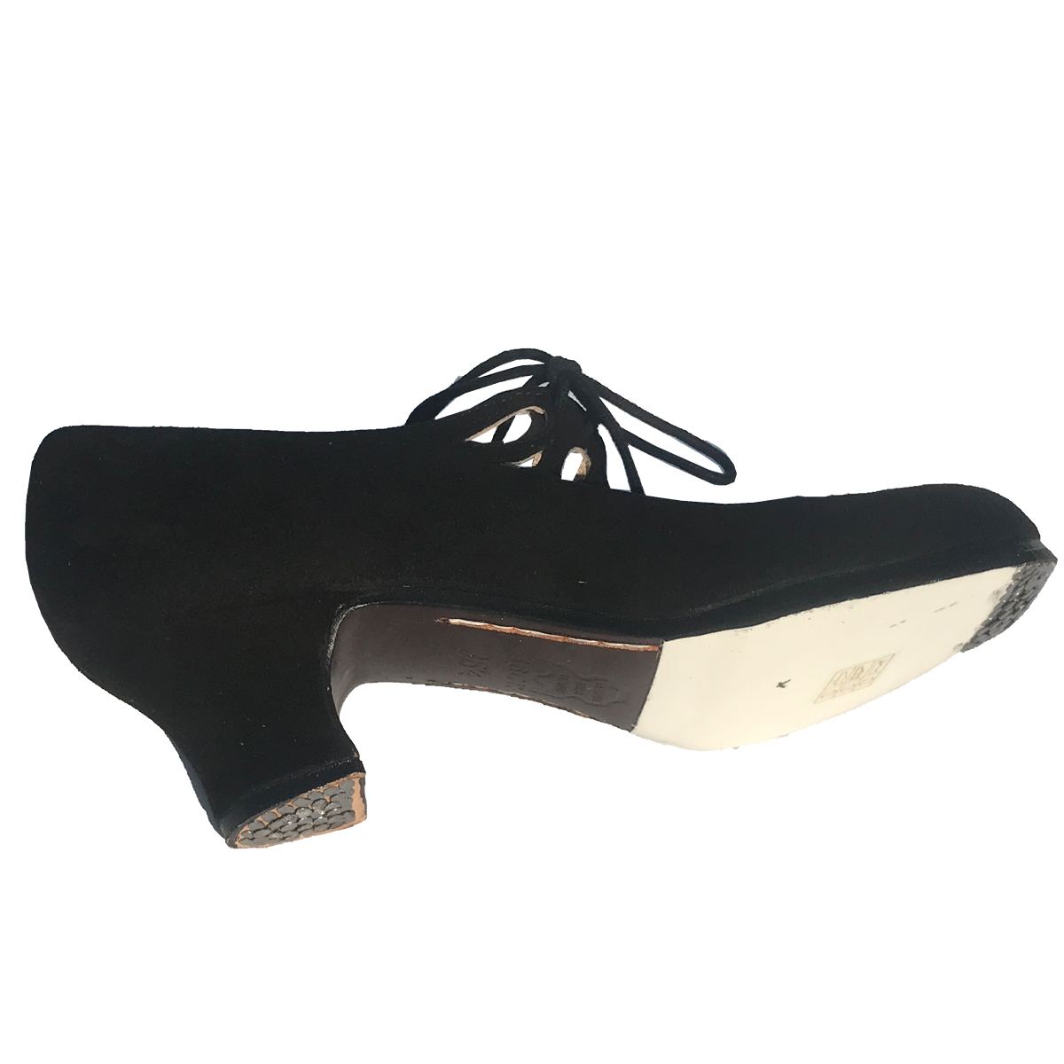 Style  M54 - CORDONERA CALADO - handmade flamenco shoe by Begoña Cervera in soft black suede, nailed, front part with anti-slip, leather covered heel - 50mm.  Other heights and shapes as well as materials available on request. 100% MADE IN SPAIN.