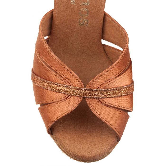 The latin shoe R505 by Rummos made of dark tan satin with glitter applications, 7cm heel and suede soles.
