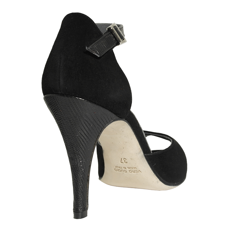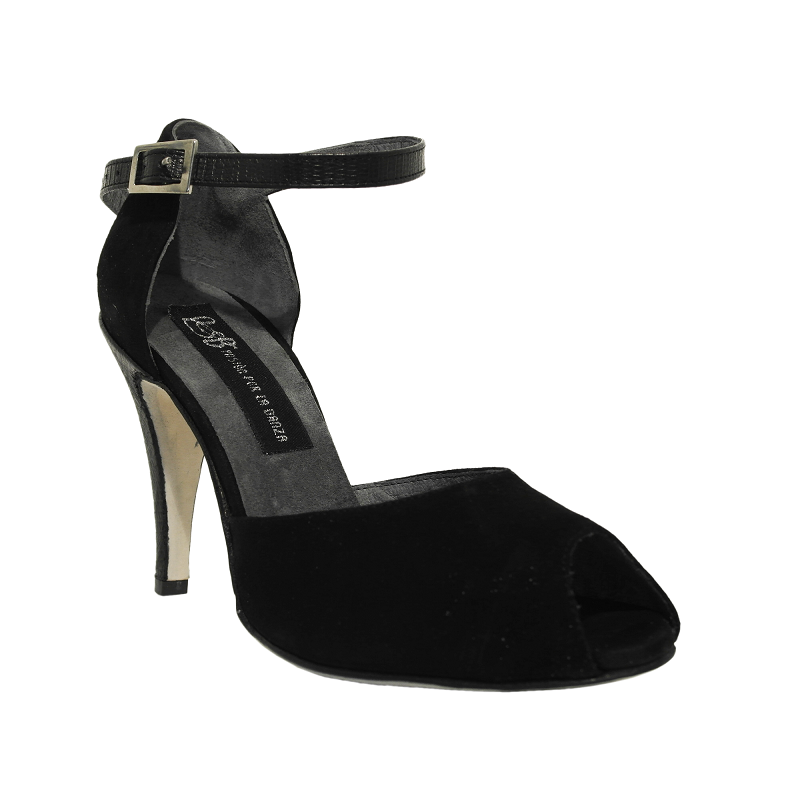 Peeptoe made of soft sheep suede in combination with Lizard-printed strap and heel, leather lined and cushioned insole, 90 mm heel, rounded off by a finely polished, generous metal buckle, easy to close , a robust but elegant shoe made of high quality materials, untreated leather sole, therefore good grip on all floors, also suitable for outdoor use !! Colors: red or black