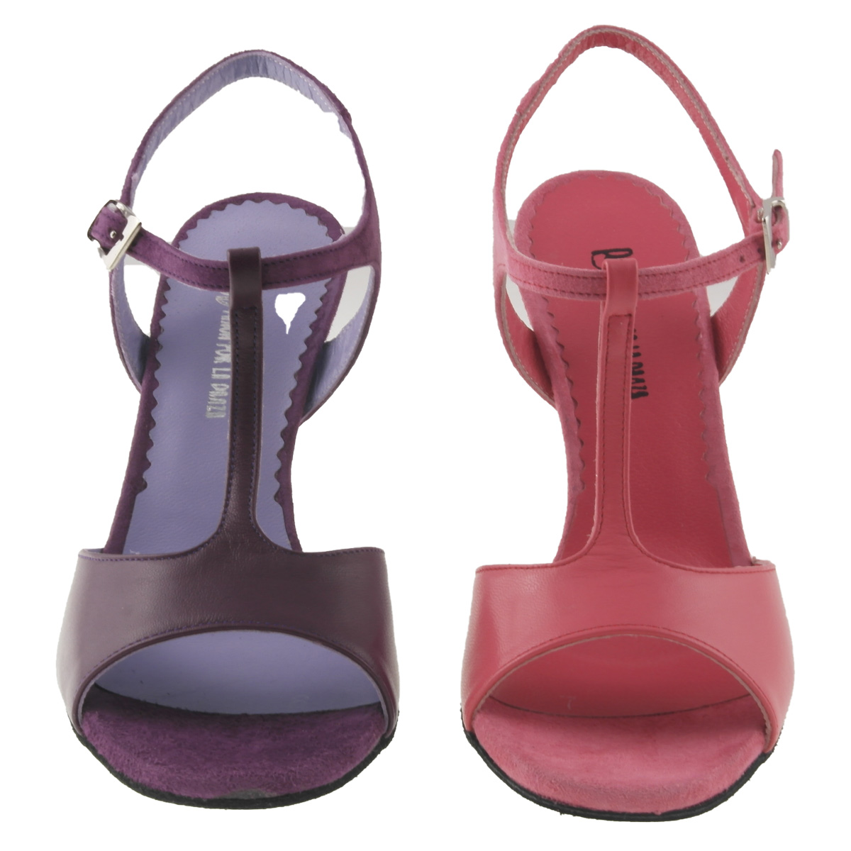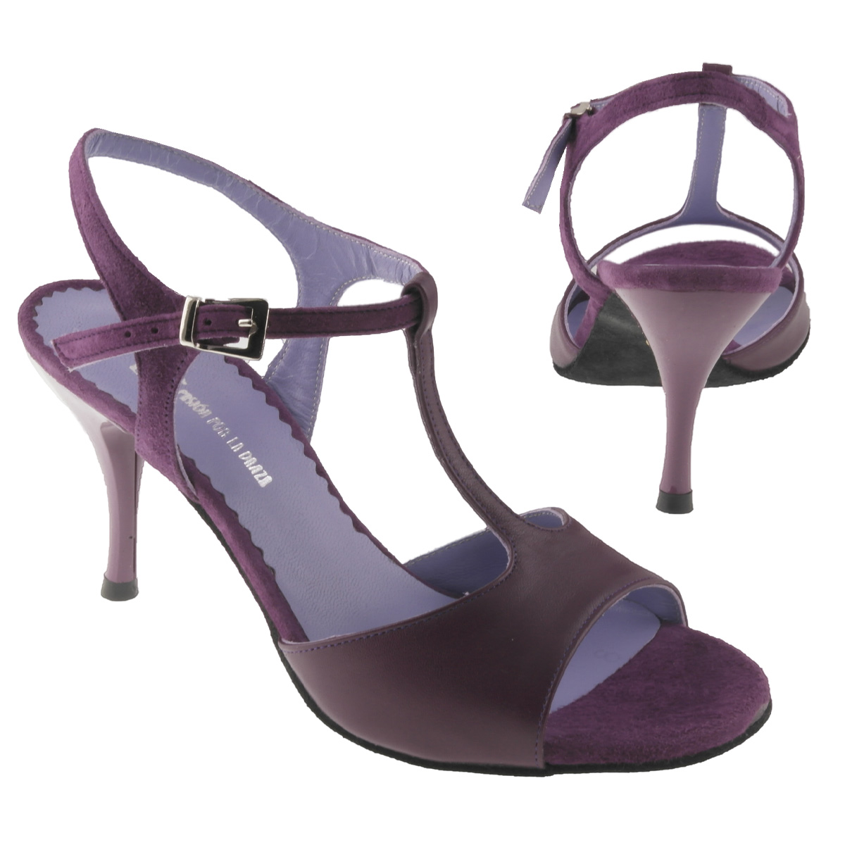 Summer is coming !! - Tango Sling Sandal with a grippy suede sole and t-bar: ELADIA by Porteño & Bailarina - the popular danceshoe brand, that has found its way onto the dance floors in Buenos Aires. Soft but durable foaming between insole and dance soles, as well as plant-dyed leather are just a trademark of P & B - PASION POR LA DANZA. Here are beautiful colors at the beginning of the pleasant seasons. Model ELADIA (964) has a wider platform and is therefore very suitable for women with the same length of toes (or at least 3 equally long ones) as the sole is slightly wider at the front and the toes do not touch the floor - women are often seen with their big and small toes hanging over the sole edge - they are perfectly stored on this wider platform. Attention ! The shoe is therefore not an extremely wide fit. It is more a good medium fit. Here in a combination of soft nappa at the front and soft suede on the straps - both in soft violet - featuring a 80mm acrylic heel, dyed in matching colour.