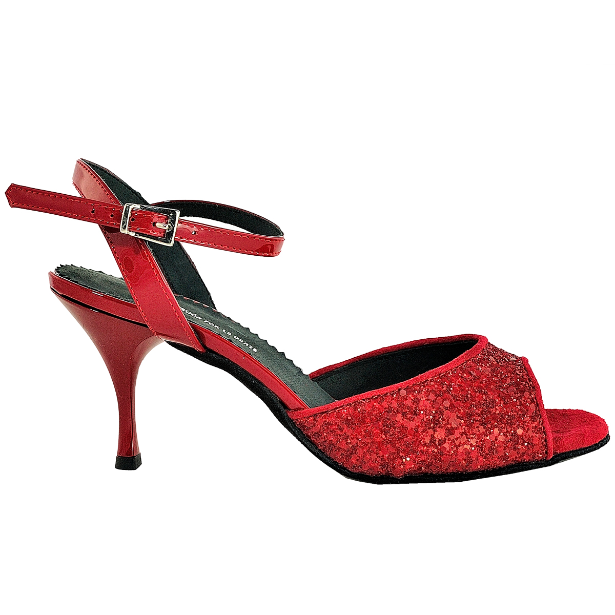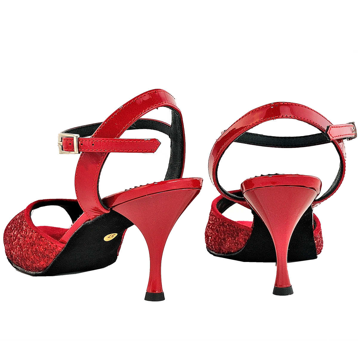 Porteño & Bailarina's danceshoe style No.1620 in red Crystal, bordered with soft suede in matching colour. 60mm or 70mm heel. The sole, as ususal feature by P&B, skimmed extremely well with a high-density foam. So it stays nice and stable for a long time, leather plant dyed in Europe and absolutely toxical-free. A soft and grippy non-slip suede sole, handmade by Porteño & Bailarina in Italy. Make sure that heel grows with the sizes. A heel height is measured at size 37.