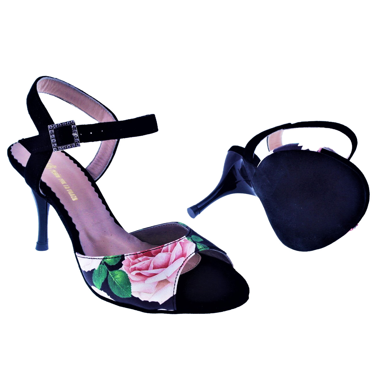 A new style from the "Colors of Nature" collection by Porteño & Bailarina - STELLA ROSALBA - with its roses tatoo printed leather, combined with soft short-haired suede. A noble rhinestone buckle completes the design. Heel = 80 mm, grippy suede dance sole. The Colors of Nature collection has a new bale padding, in addition to the popular, extremely well cushioned footbed, which is a hallmark at P & B's, now comes an extra bungee pad, which acts as a cushioning for your metatarsal bone, but is also used as a glide-stopper that works as a slip-through-brake. More comfort is not possible ... A dream for all Tango feet that tire too fast or cause pain.