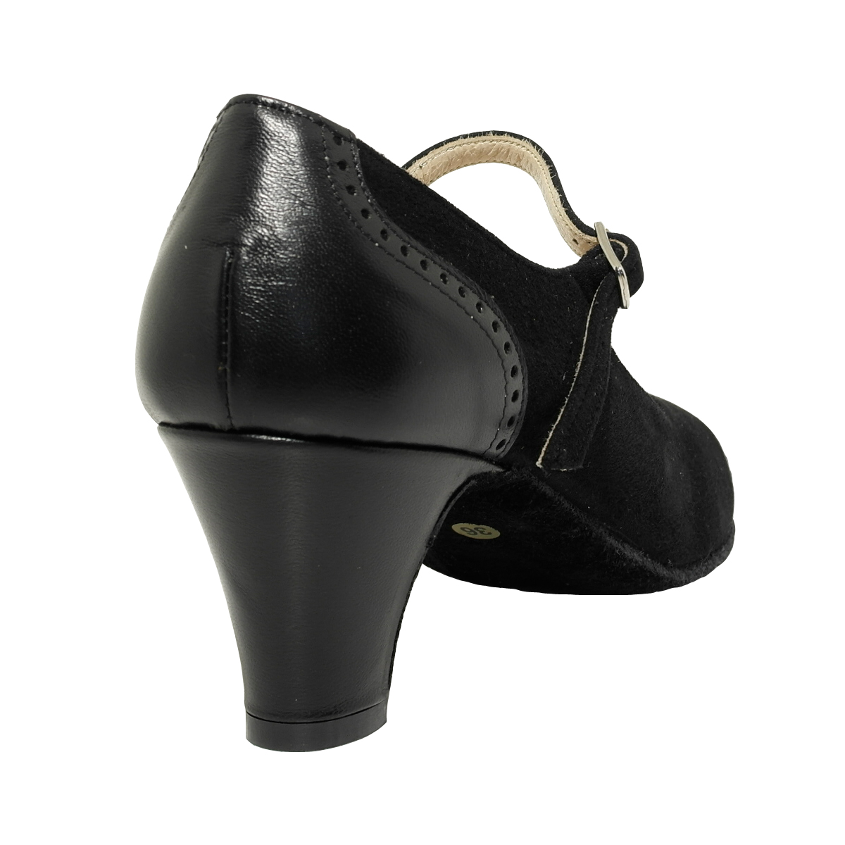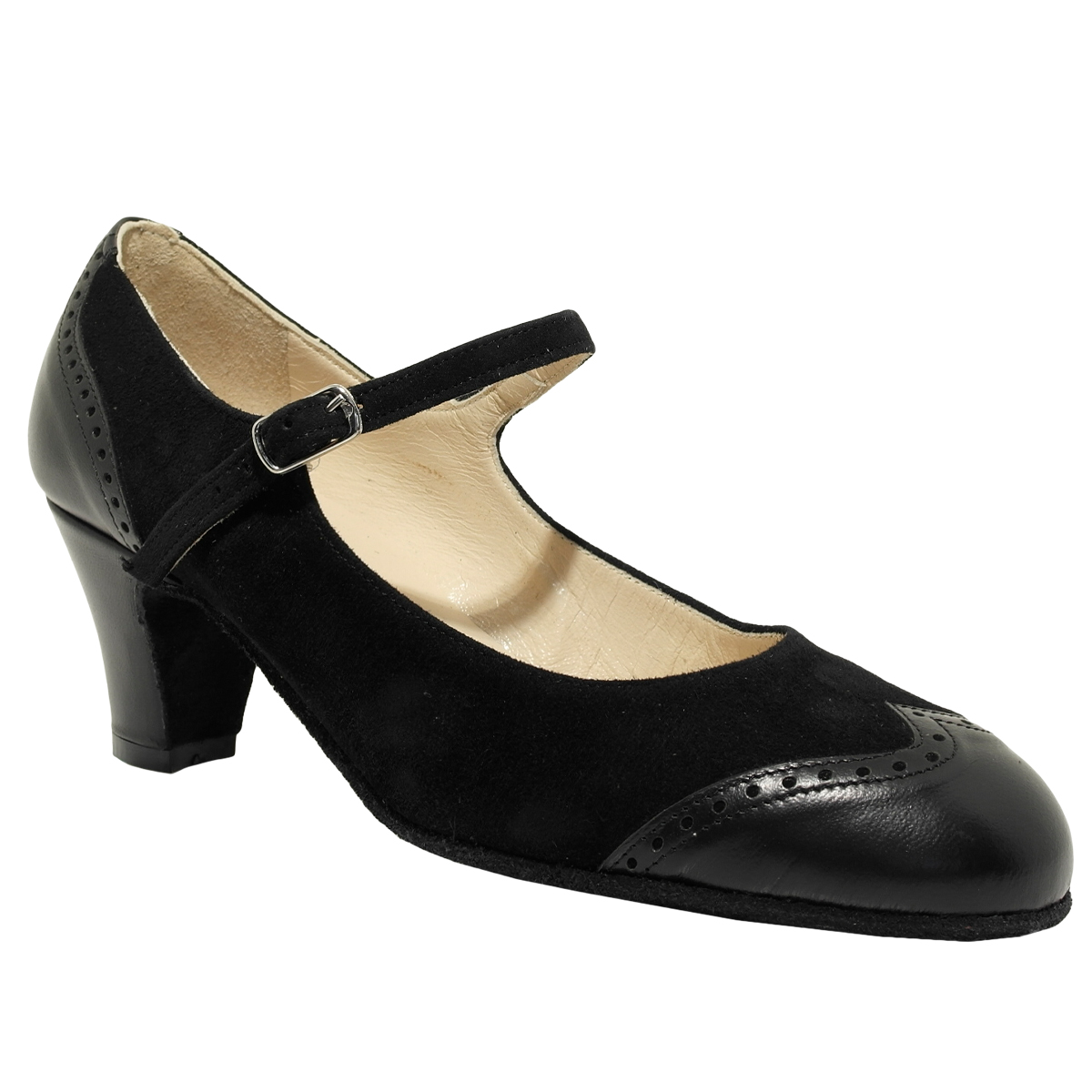 A closed variation in a vintage duotone look, 50 mm heel and suede sole. A nice model for tall women or as a practice version for the course. But also gladly bought for swing.