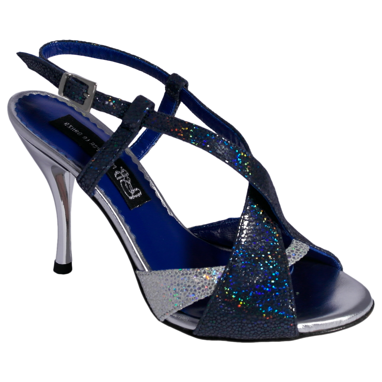 Model Naomi in a white-silver combination, made of material "Samba"- a little sequin covered suede. The sidestraps provide a tunnel for the strapping that ends in a sling heel. The wide, crossed over the instep front pieces give good grip where it is important. The heel of 90mm is painted silver, padded golden insole, dance sole open-pored grippy smooth leather - therefore outdoor usable, good statics, Italian craftsmanship