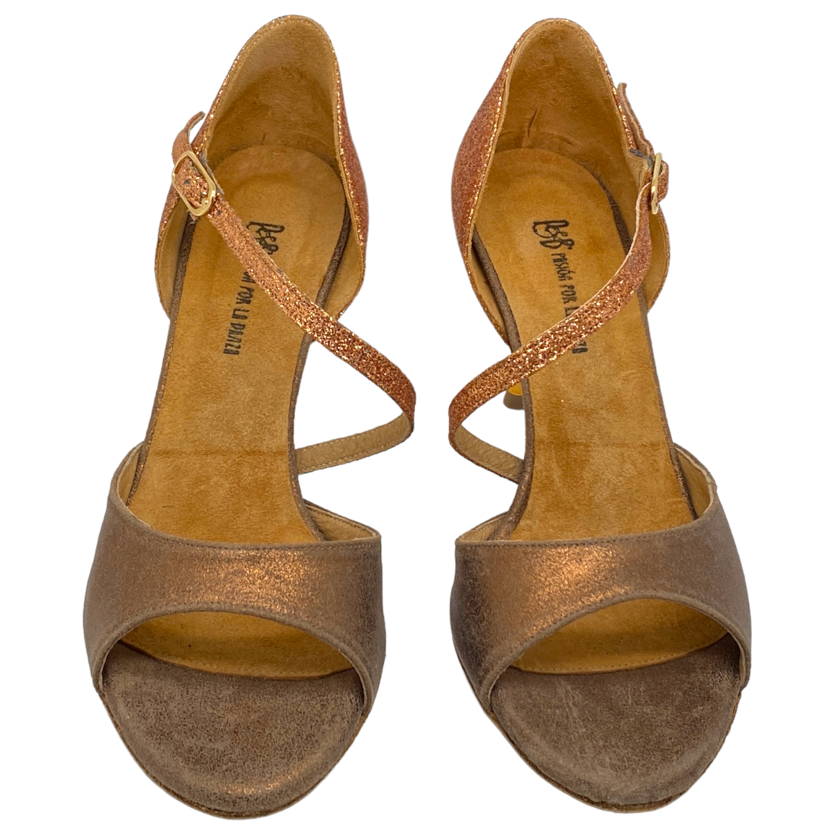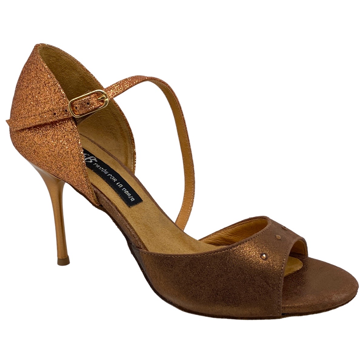 A variation of style ADA (915) on its fascinating shape which brings excellent statics. Copper shimmery leather combined with a micro-glitter part at the heel. A diagonal strap with easy clip-closing ensures support over the instep. 95 mm black air-brushed acrylic heel, like all Portena & Bailarina models well cushioned on a grippy suede dance sole.