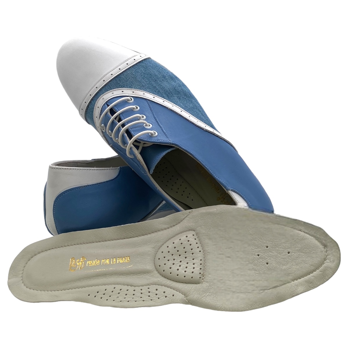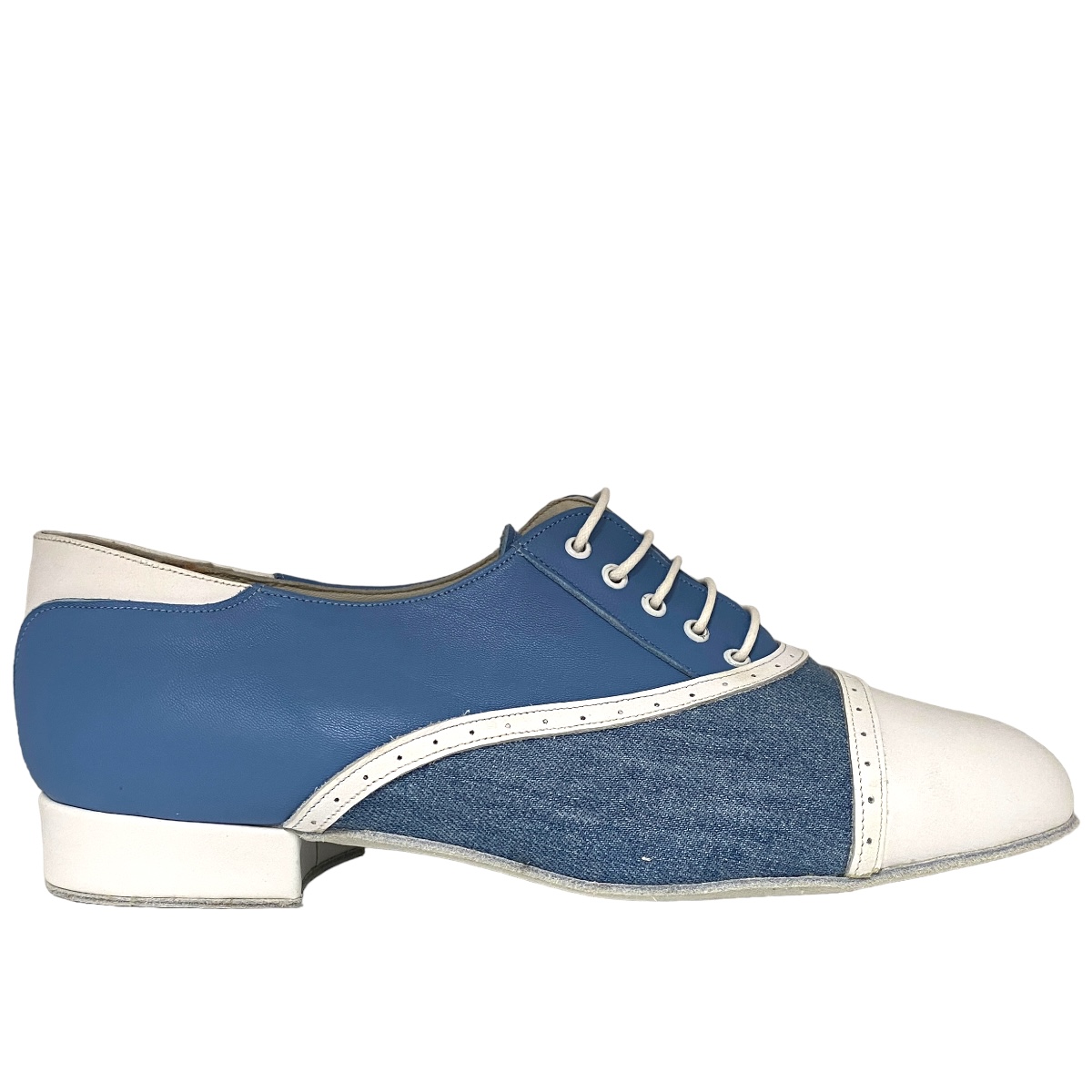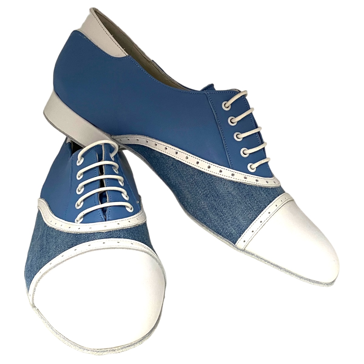 Young - cheeky and elegant - the line 15112 handmade in Italy - fancy materials, plant-dyed leather, color combinations - soft flexible (split) suede sole with flat 2 cm heel - here a variation of white calf and blu nappa leather combined with light blue Jeans - special !! this style comes with a removable insole.. so you usually wear an orthopadic insole? - no problem with this danceshoe, just change it out and make happy your orthopedics .. :)