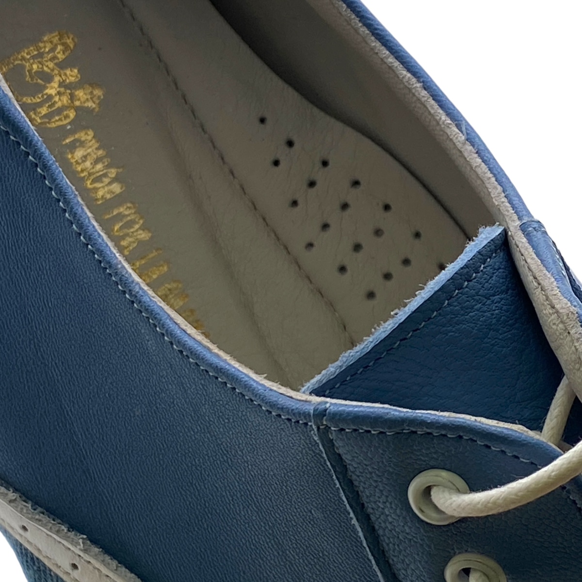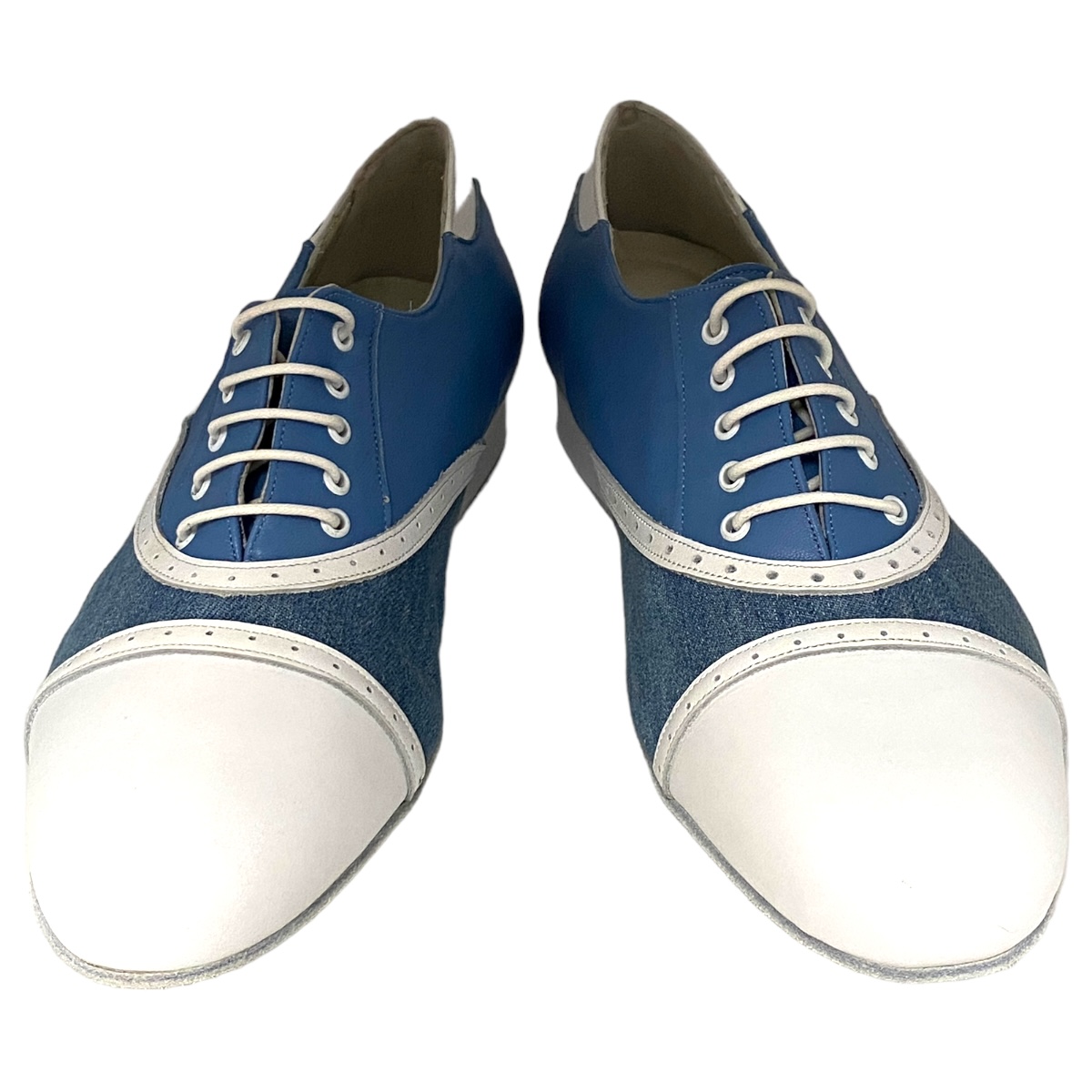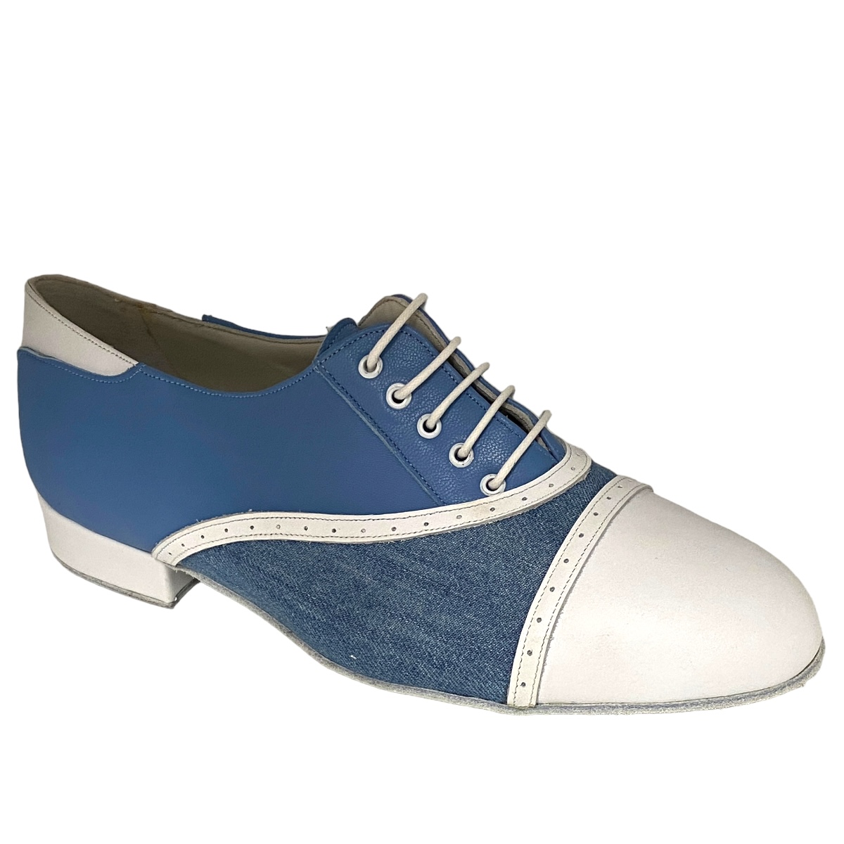 Young - cheeky and elegant - the line 15112 handmade in Italy - fancy materials, plant-dyed leather, color combinations - soft flexible (split) suede sole with flat 2 cm heel - here a variation of white calf and blu nappa leather combined with light blue Jeans - special !! this style comes with a removable insole.. so you usually wear an orthopadic insole? - no problem with this danceshoe, just change it out and make happy your orthopedics .. :)