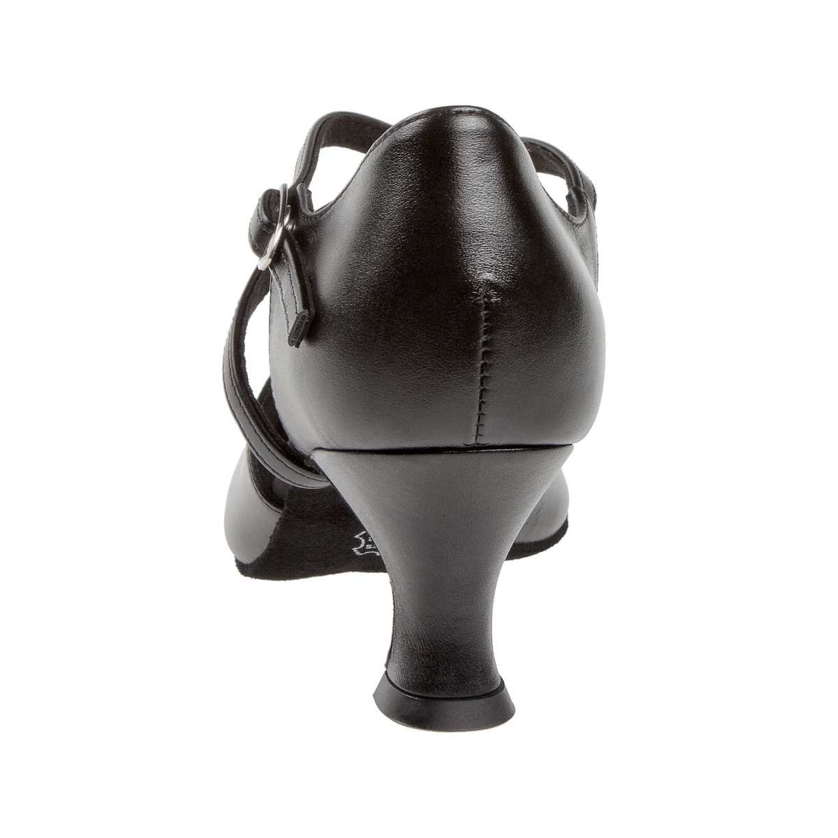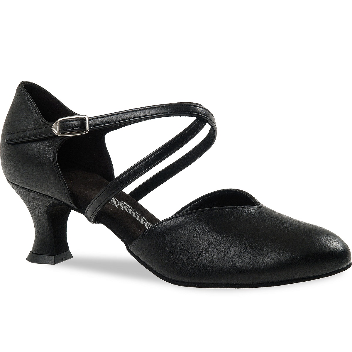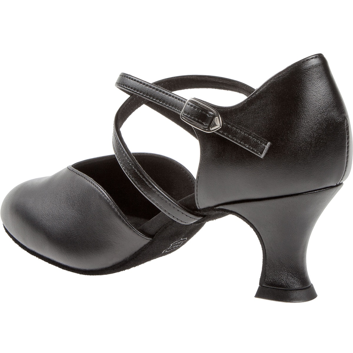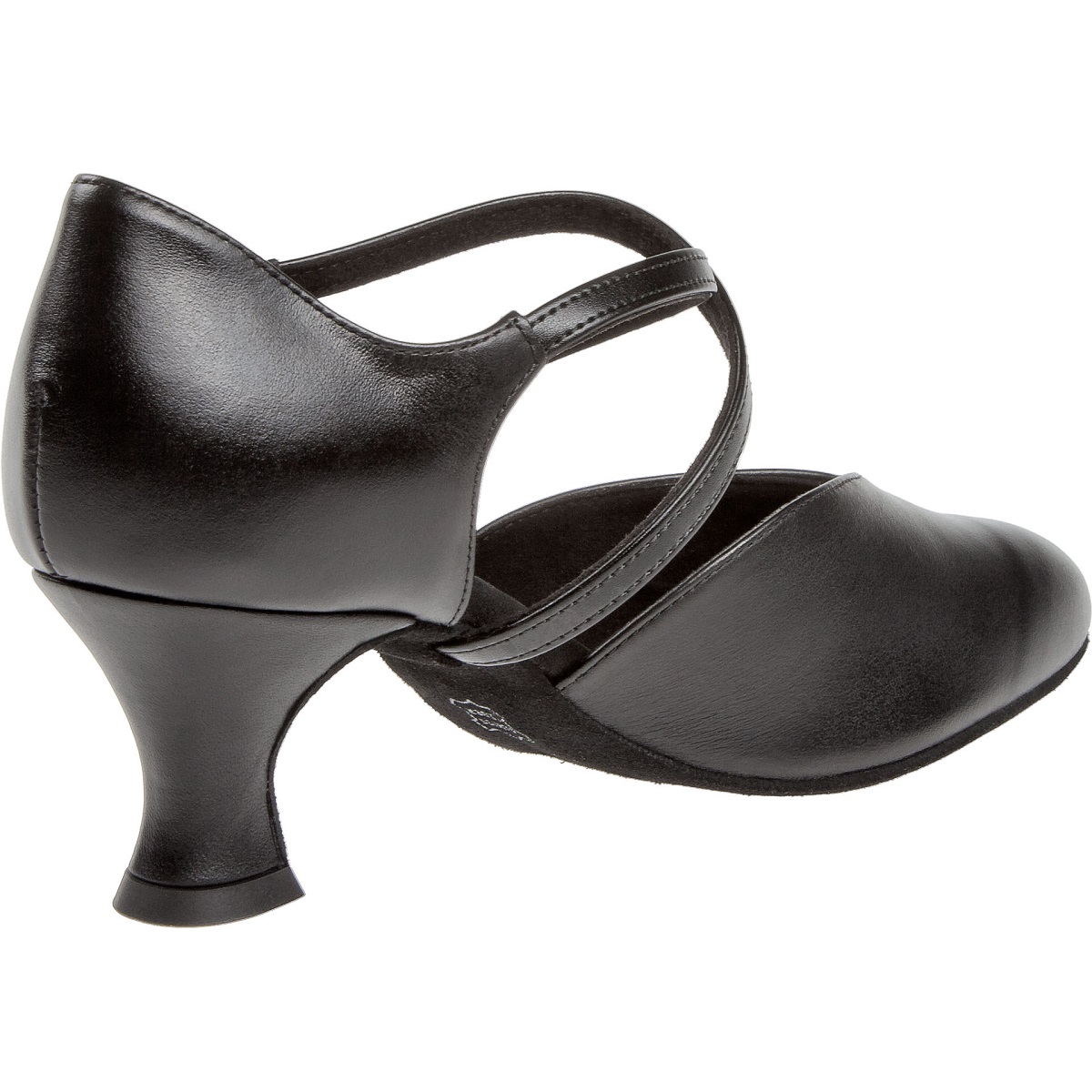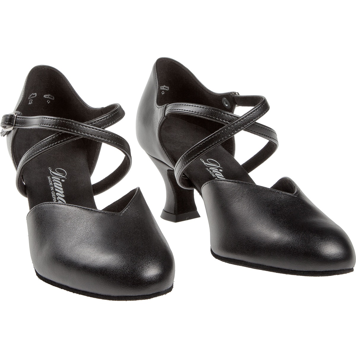 Mod. 113 Diamant ladies standard dance shoes made in Germany handcrafted in classic style with a V-cut. The closed toe pumps is featured with a infinitely variable push-button system for fast opening and closing on a intersecting heel strap. This dance shoe is manufactured in width E½ (regular width) equipped with a stable 5,5 cm Spanish heel with a larger heel area. As interior lining a breathable, antibacterial and moisture-absorbent microfiber from an Italian premium producer is used. For the upper material made out of black leather a high-class nappa from Italy is used.
