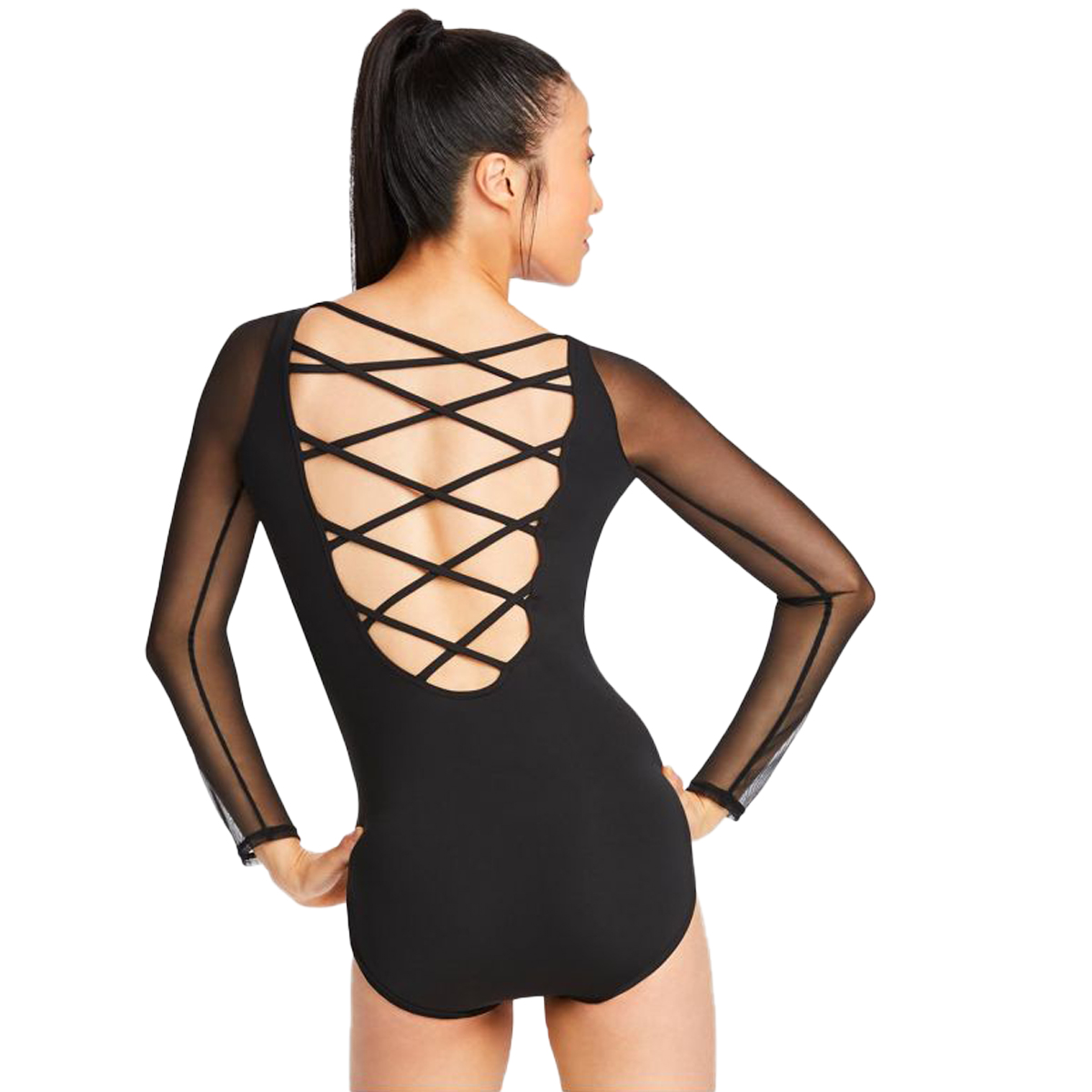 It's all about the sassy straps in the Strappy Back Long Sleeve Leotard. The flattering, deep scoop back is decorated with an open lattice design of cascading criss-cross straps. Features mesh long sleeves for stylized ventilation and full front lining for security. Keep them fascinated in this leotard ...