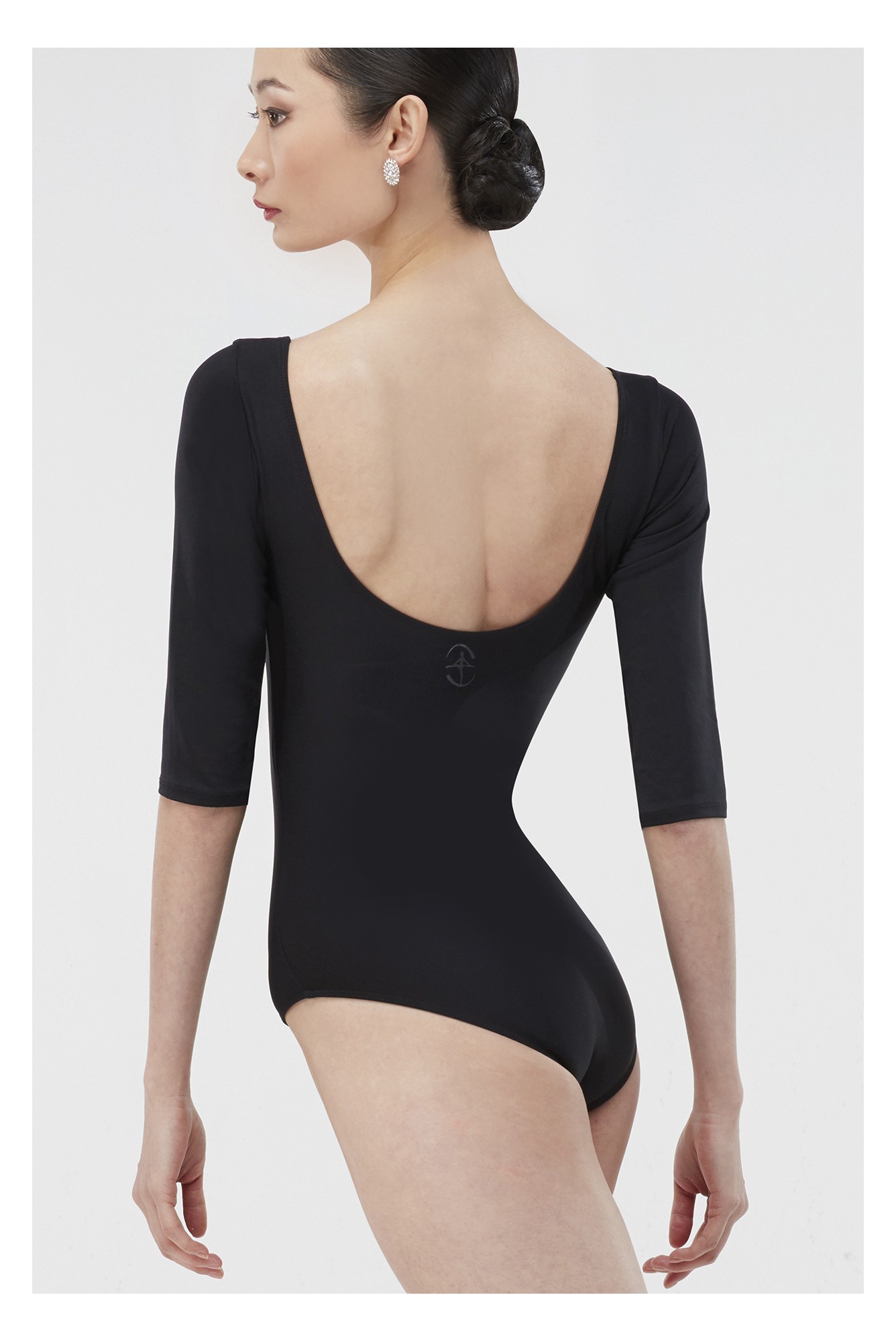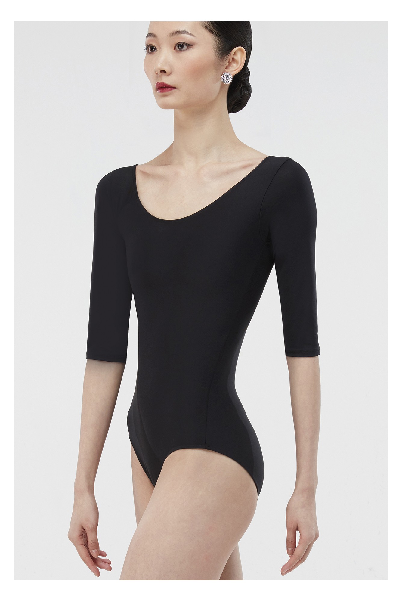 Basic leotard with full front lining, 3/4 length sleeve and scoop neck. Chest... more