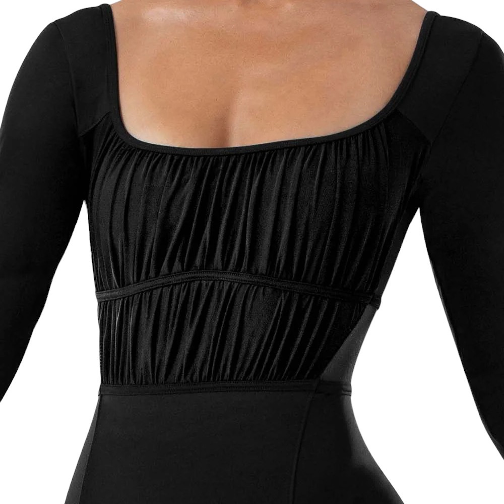 The Ladies Zoey ¾ Sleeve Leotard features a scoop neck with ruched front bodice and ¾ length sleeves. the enchanting Bloch Aurora Bloom Collection. Embracing elegance with meticulously crafted silhouettes that enhance the body's contours while delicate mesh details add a touch of drama.