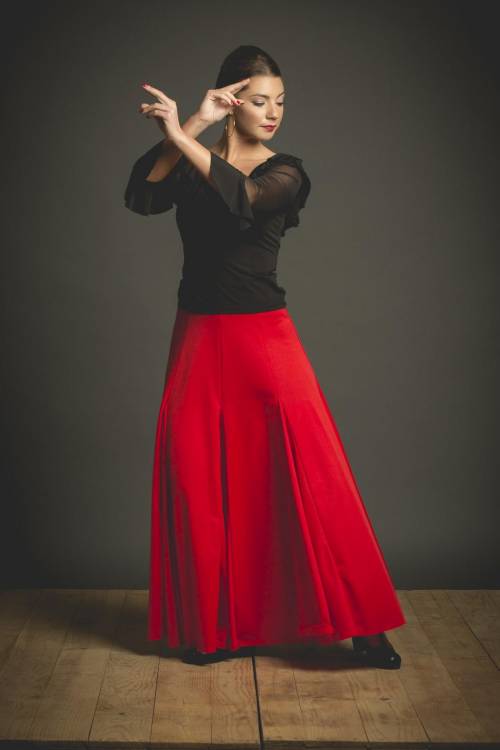 Simple black skirt for flamenco, huge width for a good movement through 8 panels with 8 inserted wedges, handmade in Spain