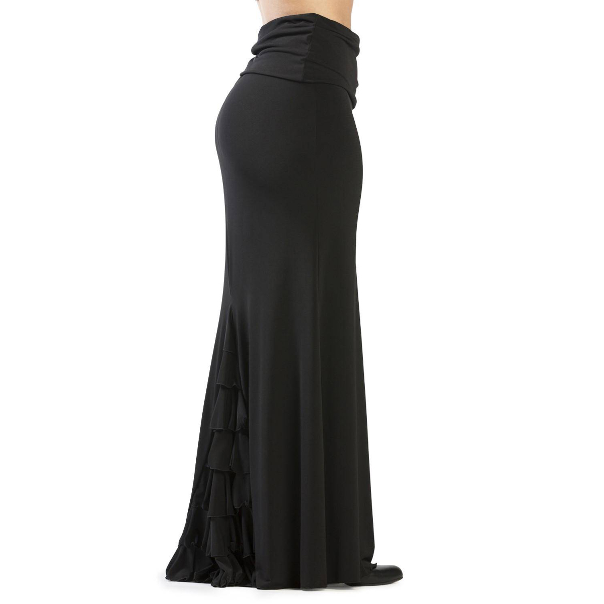 ANDUJAR by DAVEDANS, Spain, - a fancy, slim-cut skirt with a wide roll-up waistband that can be placed over the hips, at the back with a wedge of 7 generous ruffles, plus the Saeta top from the same series, fabric and design. Due to its variable length (you do not have to turn over the waistband), it is also a perfect for very tall women, even just as evening-wear.