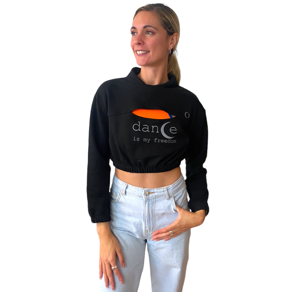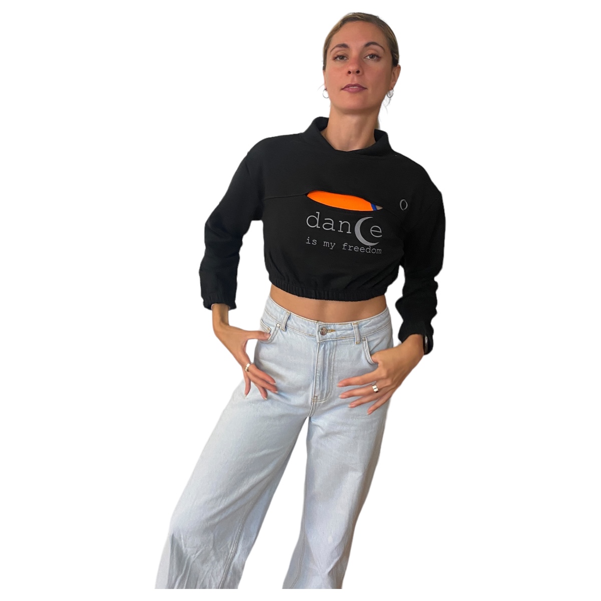 Dancers crop top with elastic cuffs at the bottom and on the arms. Thick cotton with roughened inside and high-quality print in great colors like milk, old rose or black. Large loose stand-up collar - also a great warm-up accessory - or make a statement simply combined with your jeans.