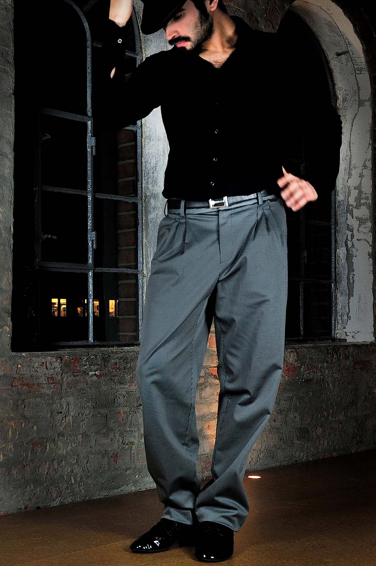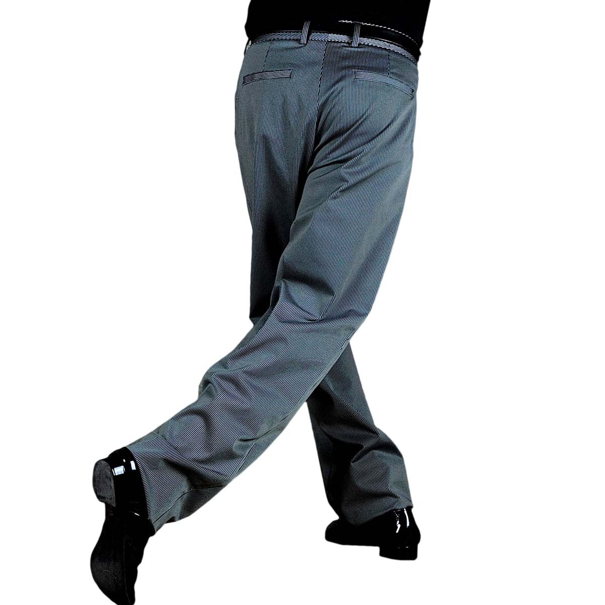 Very noble men's trousers by Porteno & Bailarina with narrow light stripes on grey, thicker quality - with elegant shine (also perfect for the show) made of 48% cotton / 49% polyester / 3% spandex, 225 grams / meter