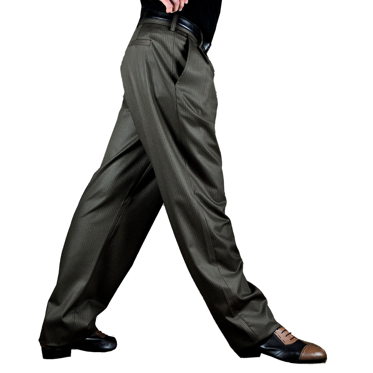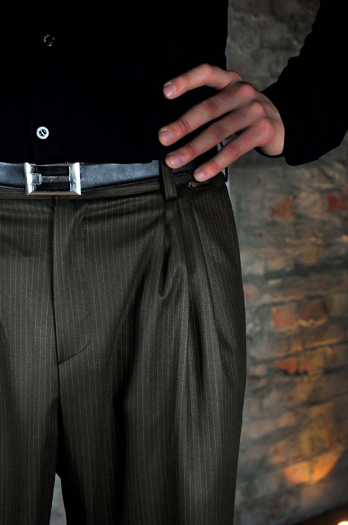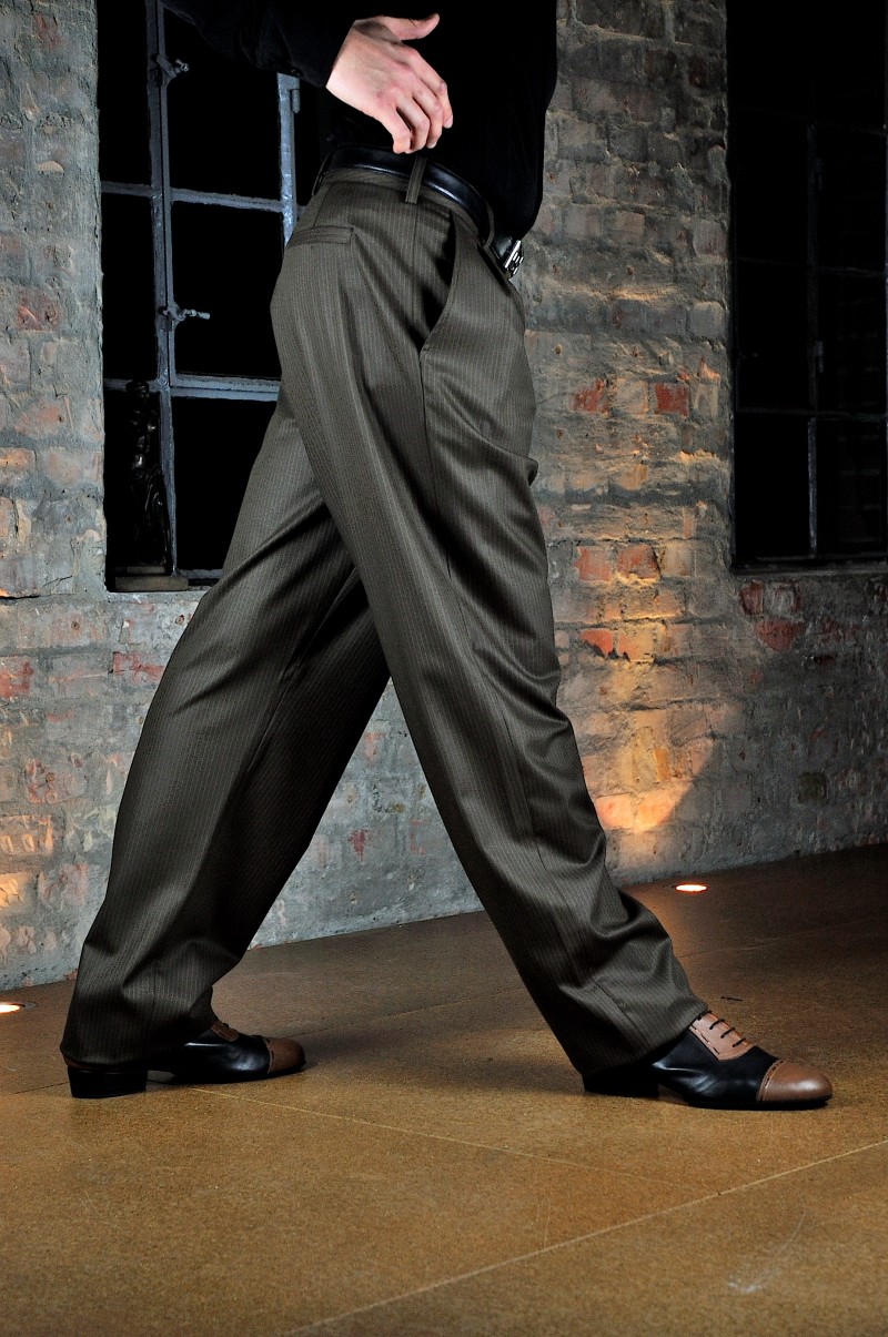 Classic tango pants with fine openwork pinstripe from Porteno & Bailarina - beautiful width through the 3 pleats - made of 35% viscose / 62% polyester / 3% spandex, 385 grams / meter - in brown with adelicate pinstripe