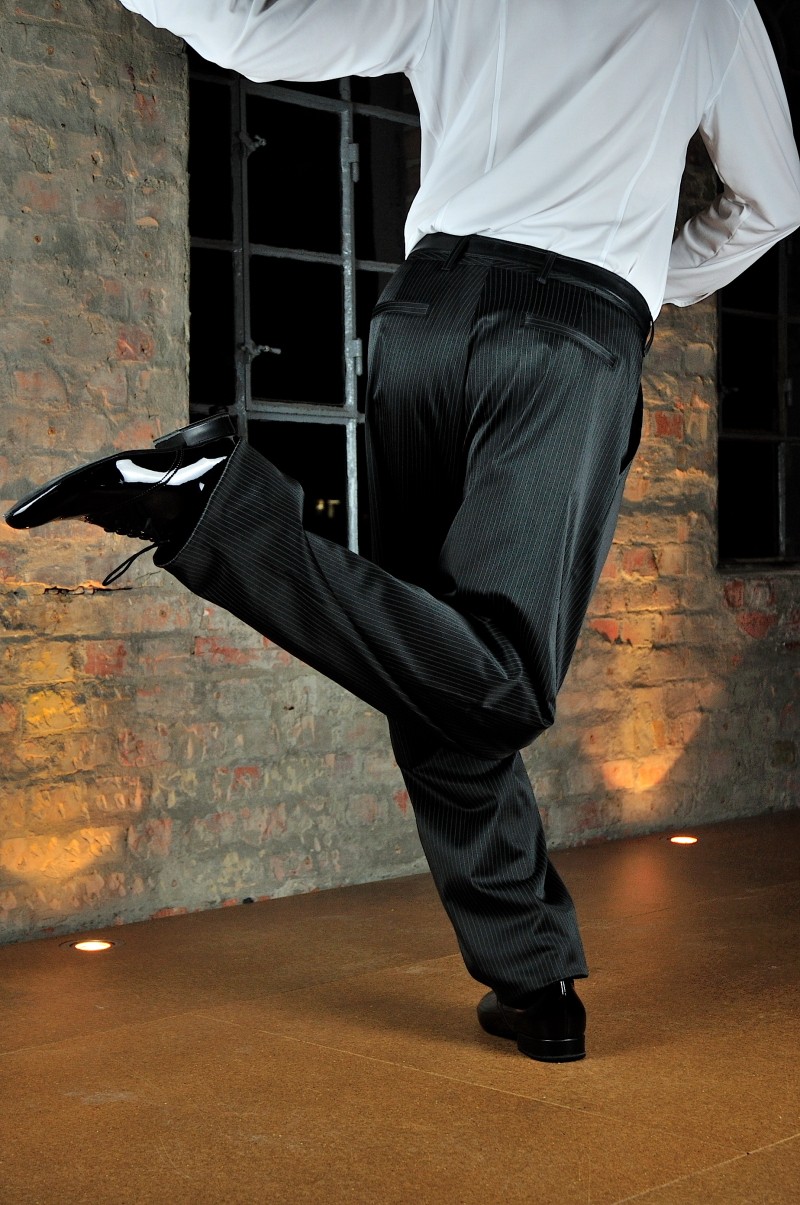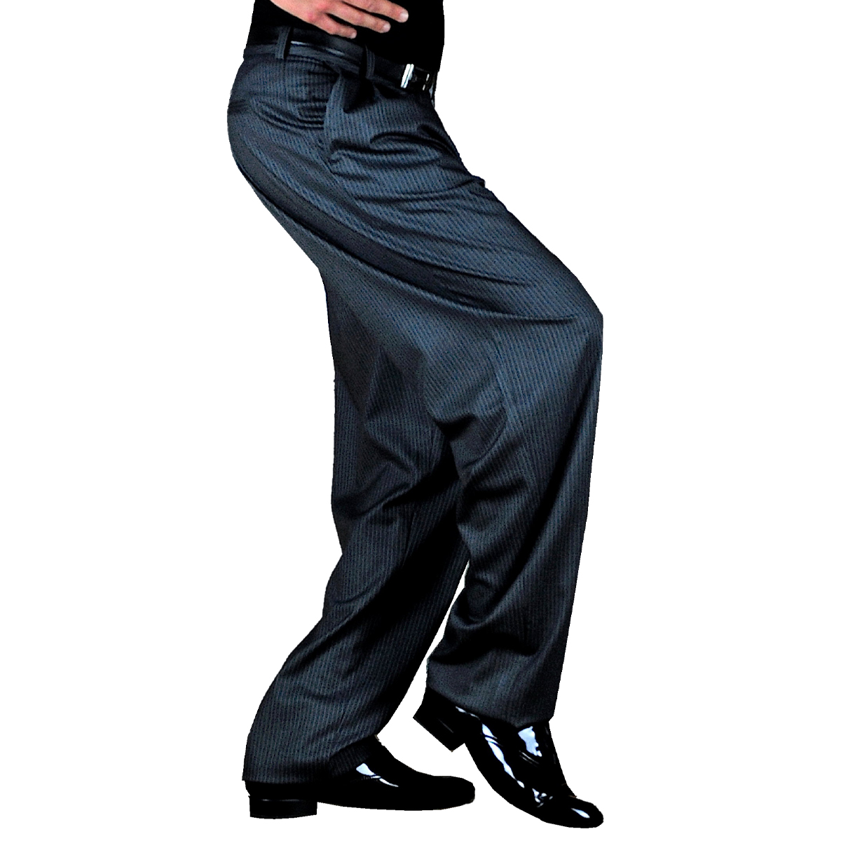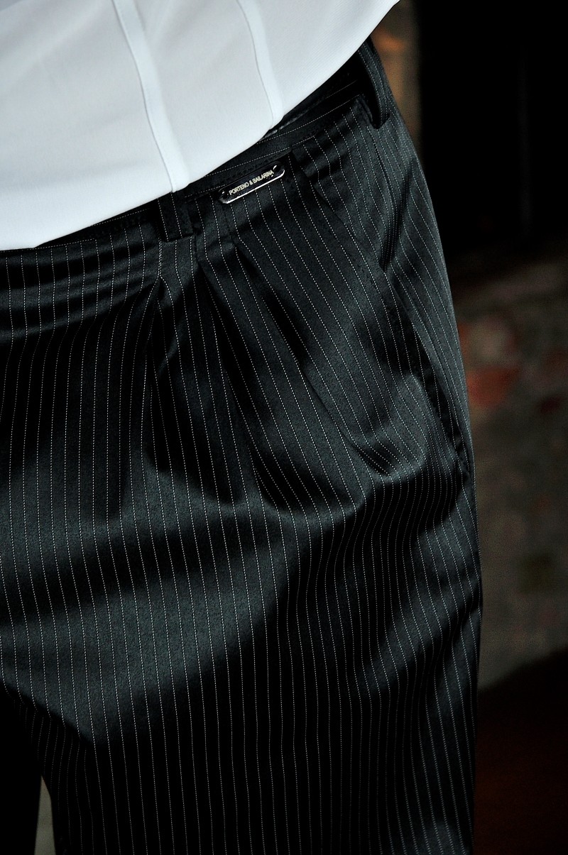 Classic, very noble black, slightly shining tango pants with fine openwork pinstripe from Porteno & Bailarina - beautiful width through 3 pleats - made of 48 % cotton / 49% polyester / 3% spandex, 225 grams / meter - in deep black with a delicate white Pinstripe - perfect for show or tango festival because fabric reflects extremely well in spotlight ...