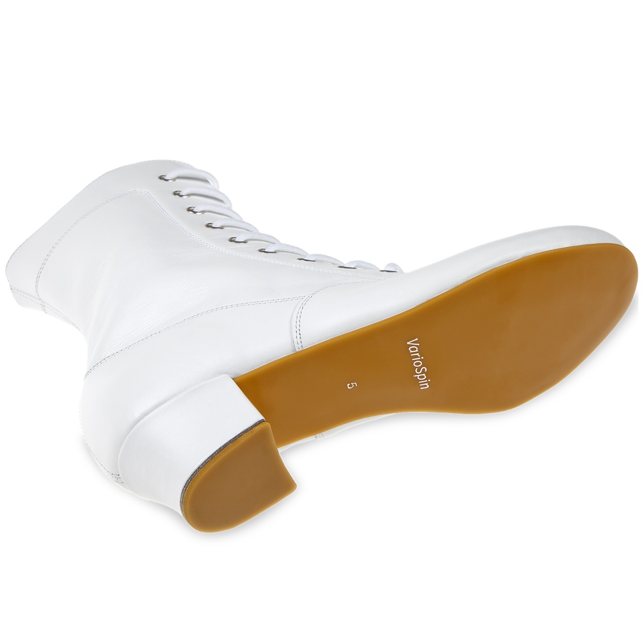 Mod. 208 women's can can boots handmade with a supportive 180 mm boot shaft with oiled corset lacing and equipped with the universally applicable VarioSpin sole for indoor and outdoor performances. This dance shoe is manufactured in width F (regular width) equipped with Diamant comfort footbed and a stable 3,7 cm Cuban heel with a very large heel area. As interior lining a breathable and moisture-absorbent microfiber from an Italian premium producer is used. For the upper material made out of white leather a high-class nappa from Italy is used.