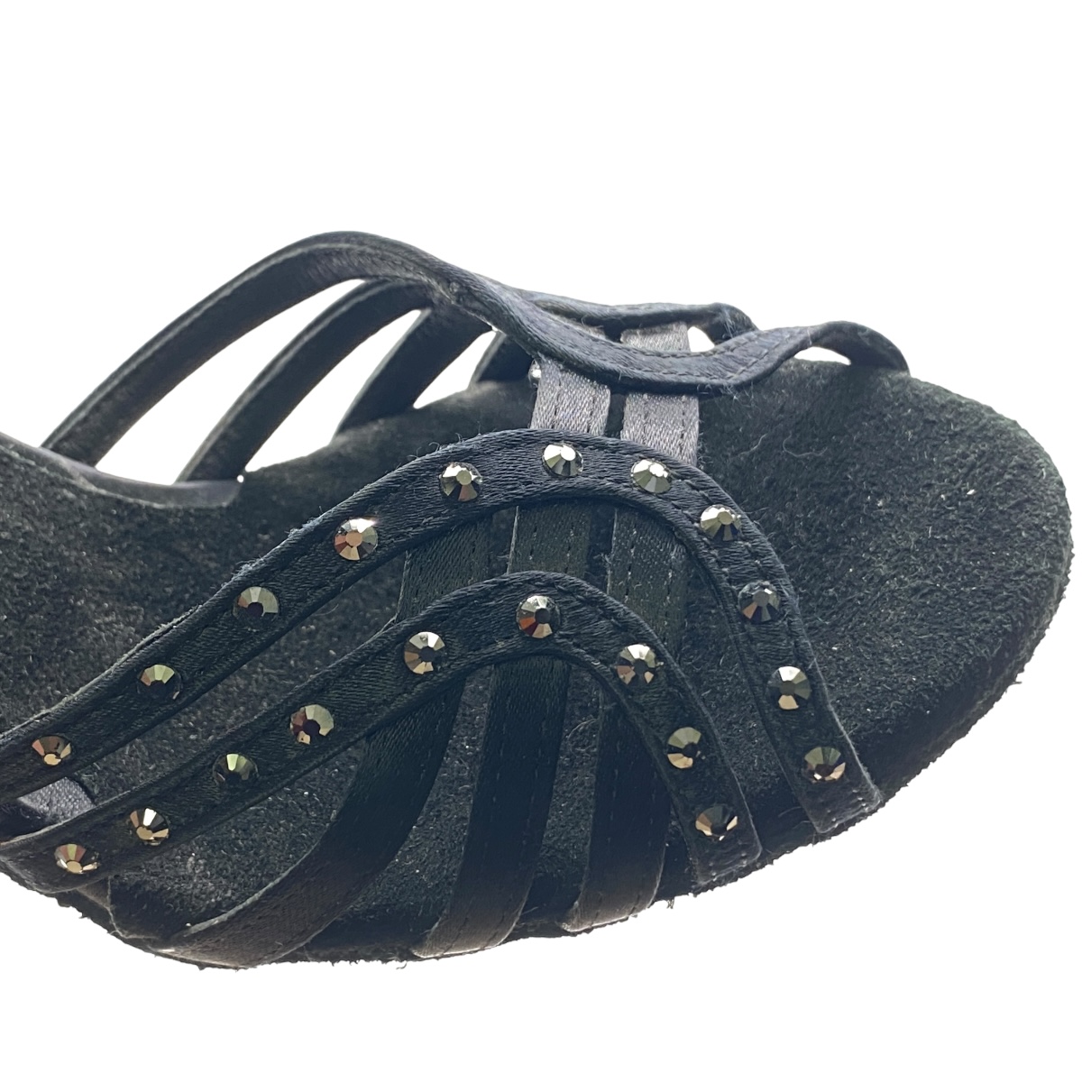 Elegant, rhinestone decorated sandal, front net-underlined, so no toe can slip out. Black satin with 90 mm heel, non-slip suede sole, soft cushioned.