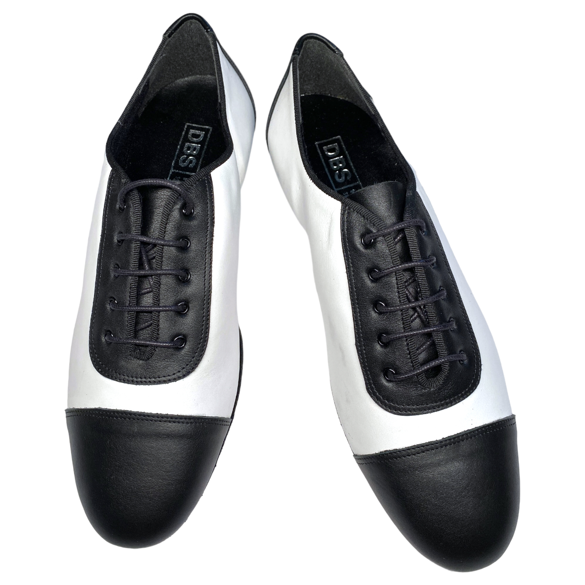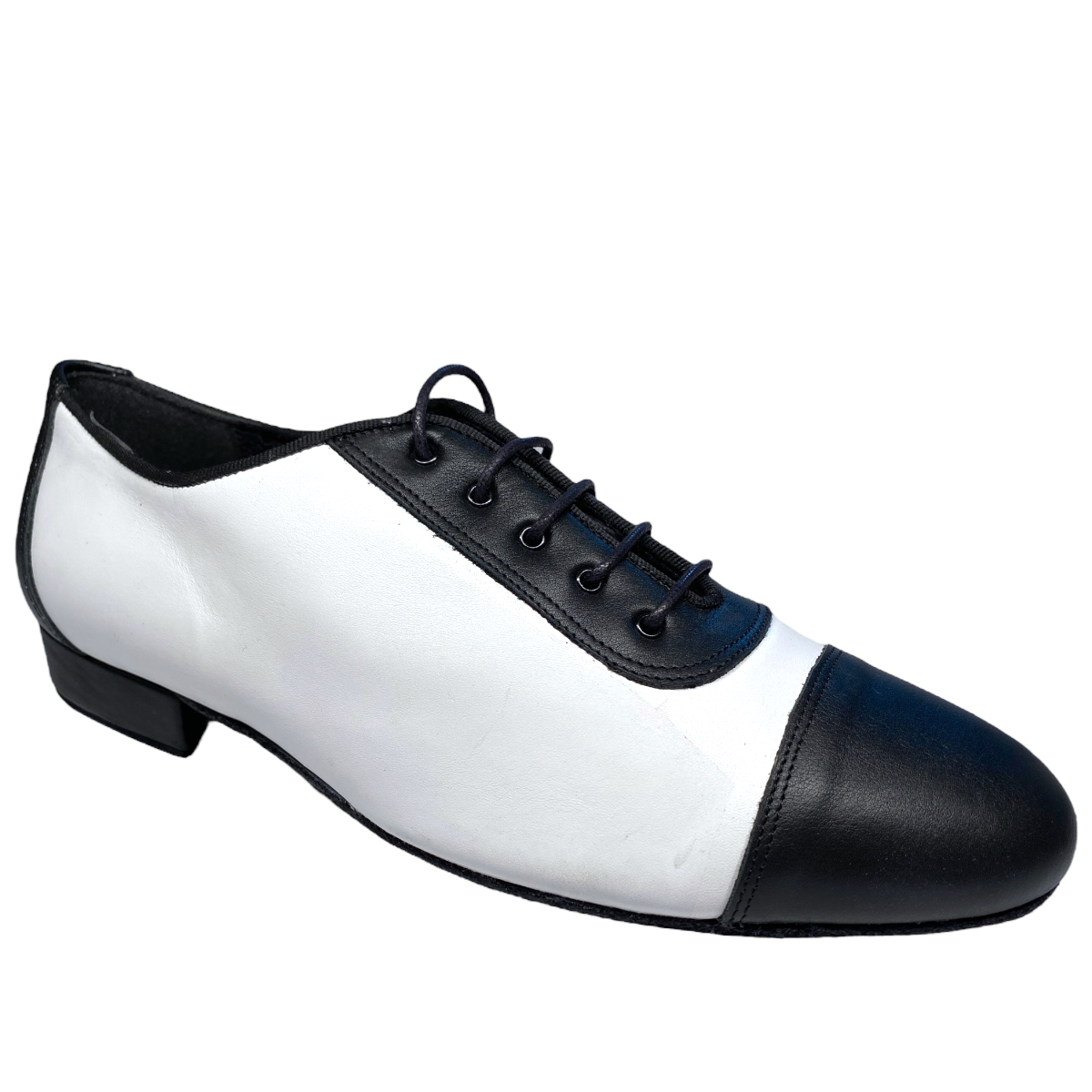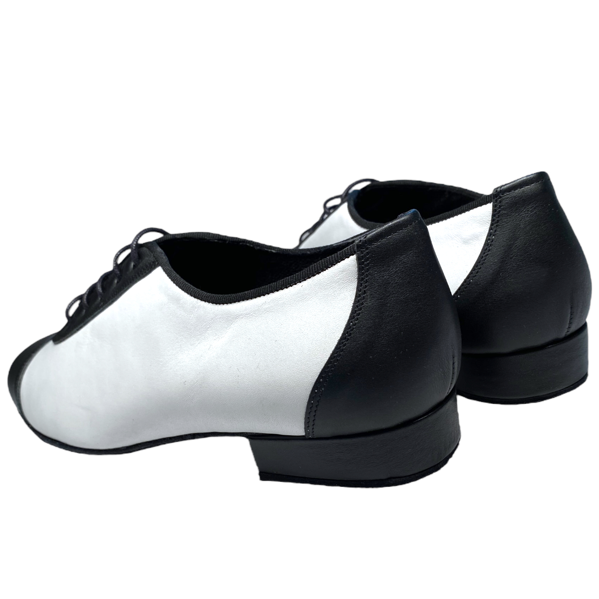 Italienischer Herren Tanzschuh in schwarz-weissem Kalbsleder, Oxford Schnürung 5-Loch, Wildledertanzsohle mit 2cm Absatz Standard, Innenfutter und Decksohle aus Leder