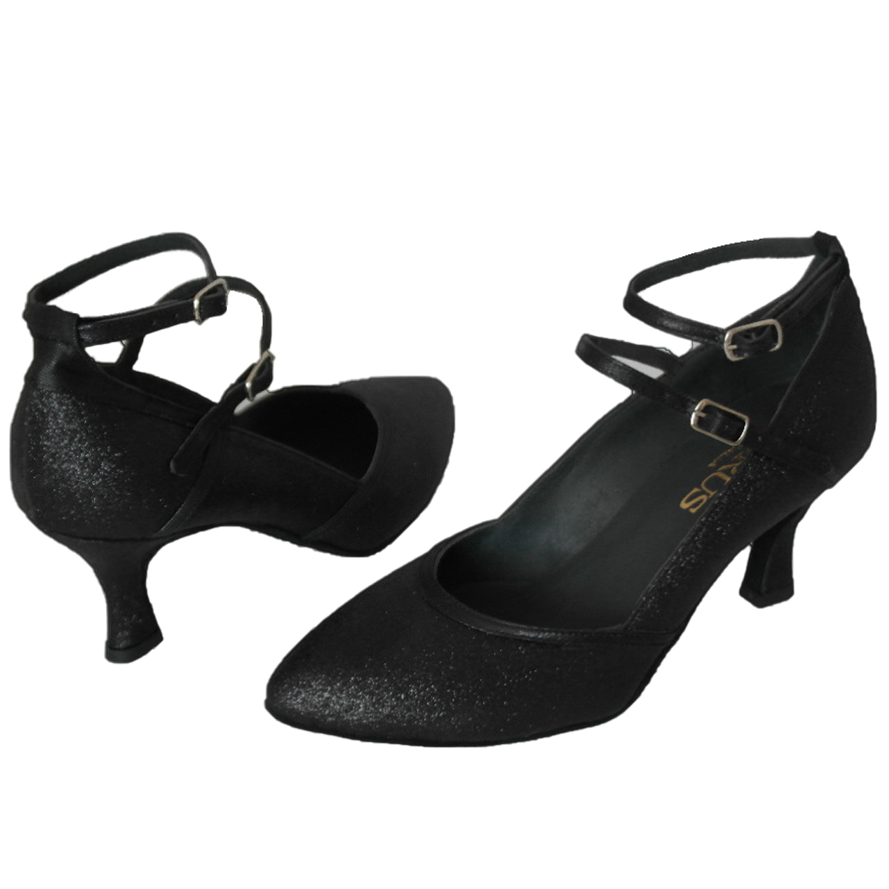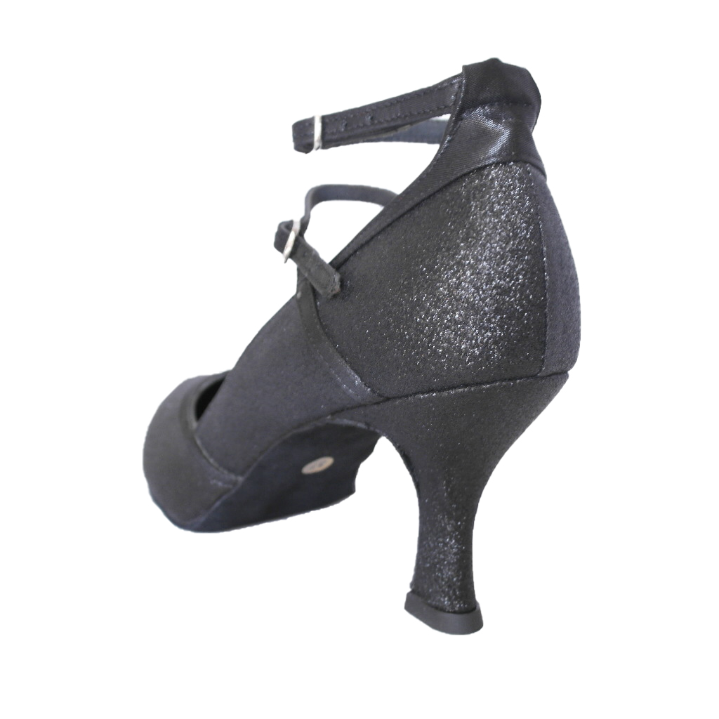 Damentanzschuh aus Glittermatterial mit zwei laminierten Verschlussriemen für doppelten Halt, Absatz 70mm leicht. ausgestellt, griffige Wildledersohle