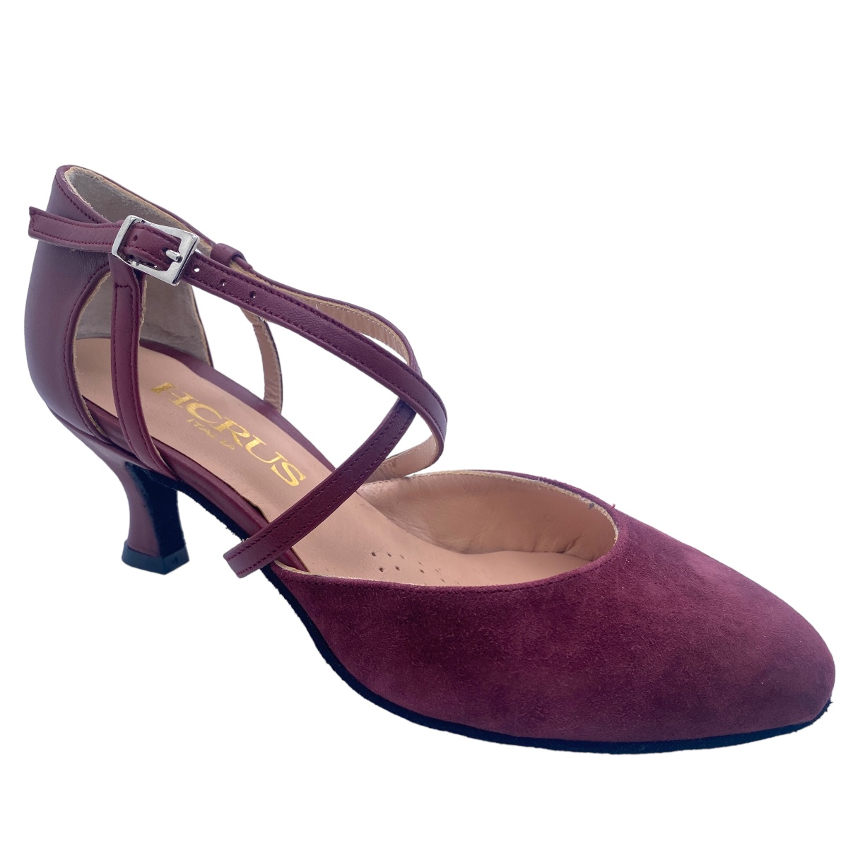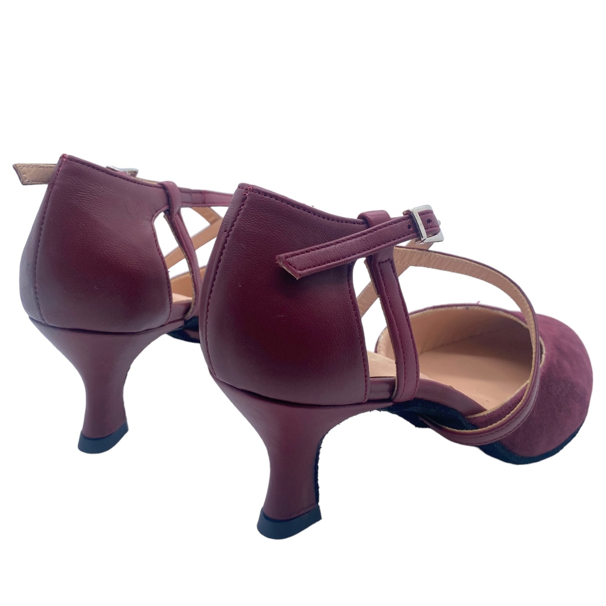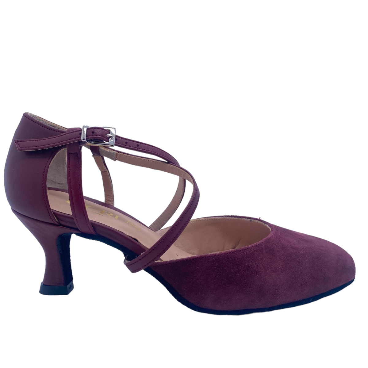Schicker italienischer Damen-Tanzschuh in einer Kombination von Nappa- und Wildleder in bordeaux mit 60 mm Absatz und griffiger Wildledersohle, weiche Innensohle, Futter und Obermaterial aus pflanzengefärbten Leder, italienische Handarbeit