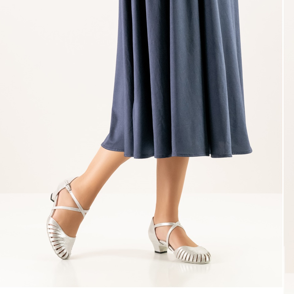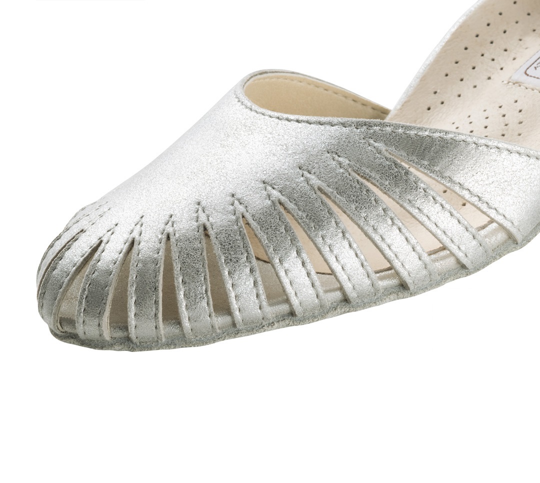 Der Damenschuh Solveig aus dem Haus Werner Kern aus silbernem Glanzvelourleder. Mit Velourlederabsatz, 3,5cm Blockabsatz, Comfort-Innensohle, Leder Innenfutter und nickelfreier Schnalle.