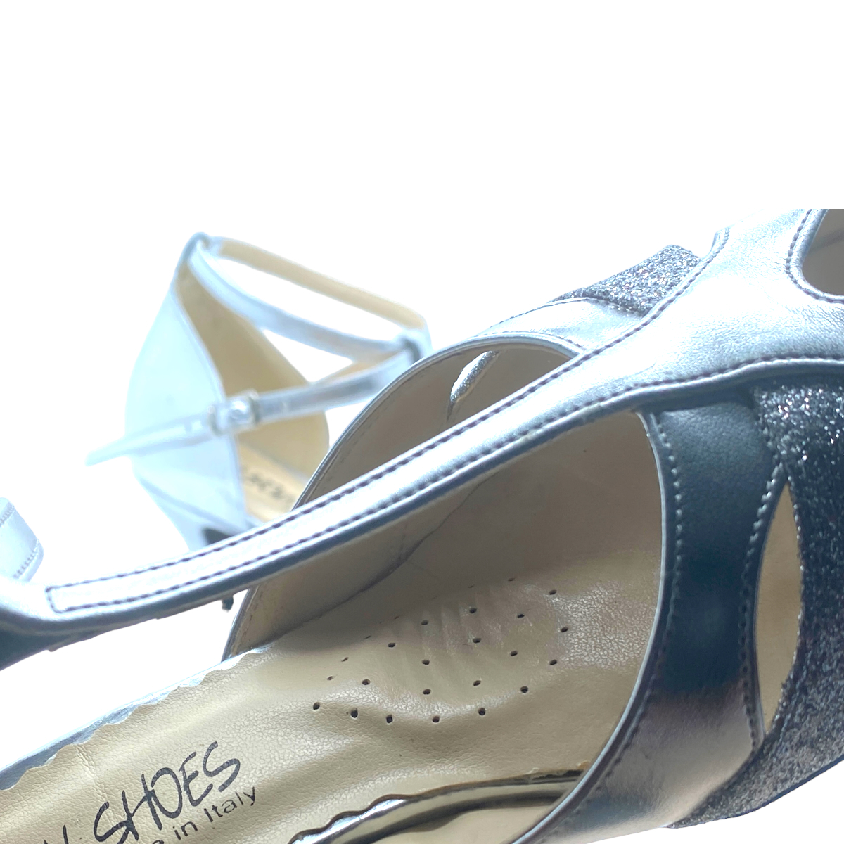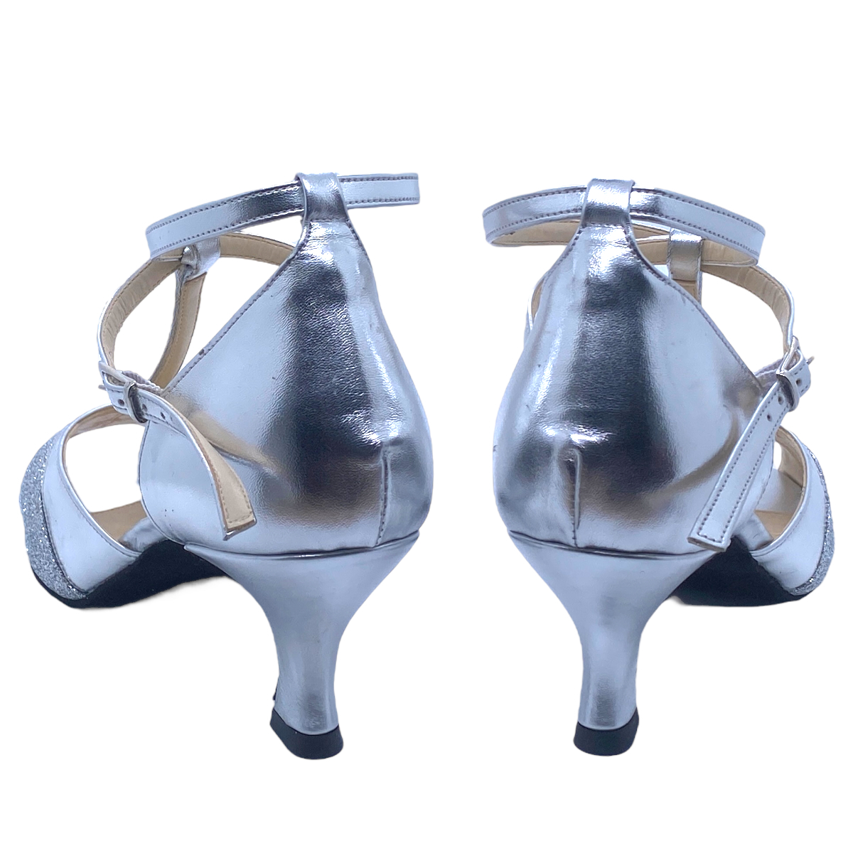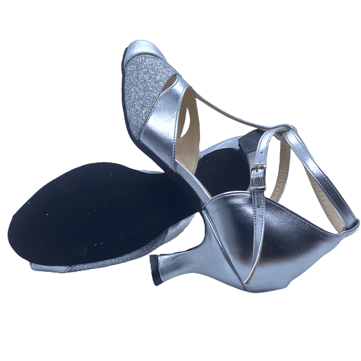 Endlich gibt es ihn auch vegan, aus zertifizierten Materialien, giftfrei aus nach europäischen DIN Normen gefertigten Materialien. Der italienische Tanzschuhklassiker - der BOCA DE LEONE (Löwenmaul) - so beliebt durch seine extrem gute Passform - hier in silber und silber Glitter - mit einer Absatzhöhe von 60 mm, griffiger Wildledersohle und guter Polsterung zwischen Kunstlederdecksohle und der Tanzsohle aus griffiiger Mikrofaser.