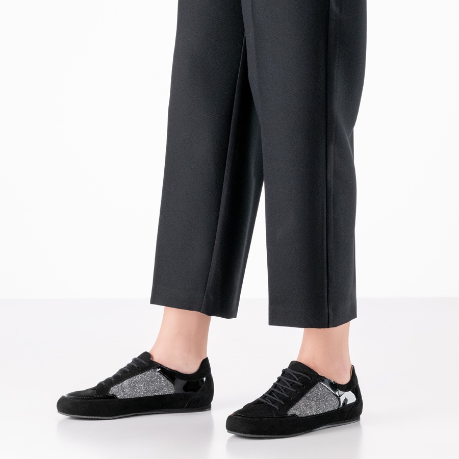 Der Tanzsneaker Carol aus dem Hause Werner Kern in einer Kombination aus schwarzem Velourleder, Lack und Brokat mit durchgängiger Velourledersohle und einer bequemen Absatzhöhe von 1 cm.