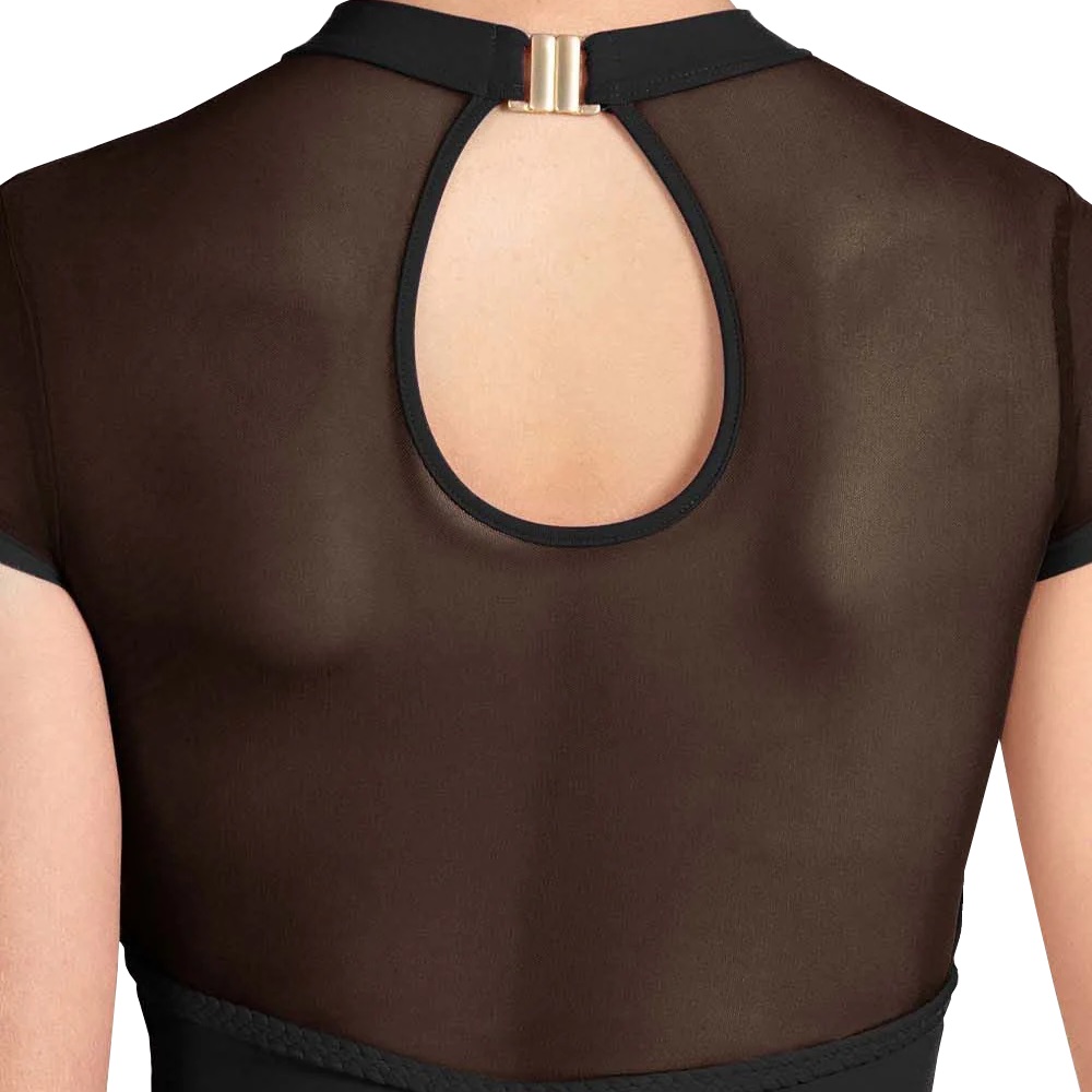 Das Damen-Trikot „Mirella Miami“ mit Flügelärmeln verfügt über weiche Mesh-Einsätze am Hals und Rücken sowie ein Schlüsselloch-Detail am Rücken und einen goldenen Hardware-Verschluss für einen sicheren Sitz. Der hohe Netzhalsausschnitt mit herzförmigem Detail verleiht nicht nur einen Hauch von Weiblichkeit, sondern sorgt auch für einen dezenten, aber raffinierten Ausschnitt. Teil der Mirella Miami-Kollektion; Es präsentiert aufwendig geflochtene Besätze, elegante Mesh-Einsätze und goldene Beschläge. Die Kollektion verfügt über eine auffällige Farbpalette, die Ihrer Tanzkleidung South Beach-Glamour verleiht.