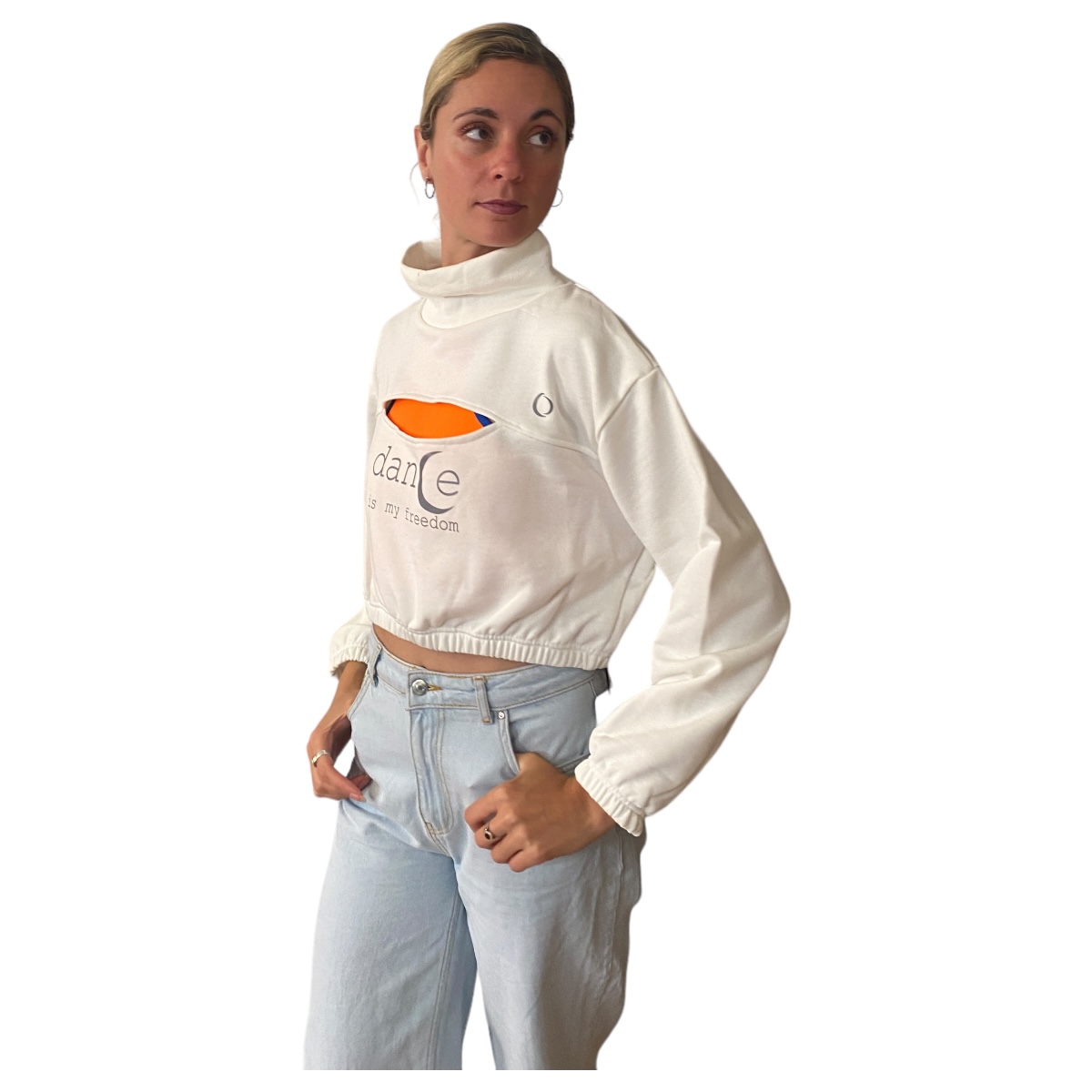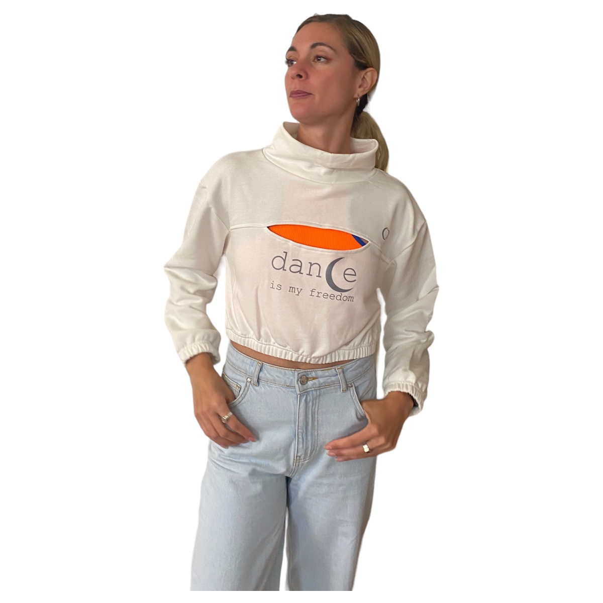Crop Top mit elastischen Bündchen im unteren Abschluß und an den Armen. Dicke innen aufgerauhte Baumwolle und hochwertigem Print in tollen Farben wie Milch, Altrose oder Schwarz Großer Lockerer Stehkragen - auch ein tolles Warm Up Assecoire - oder setze ein Statement einfach mit Deiner Jeans kombiniert