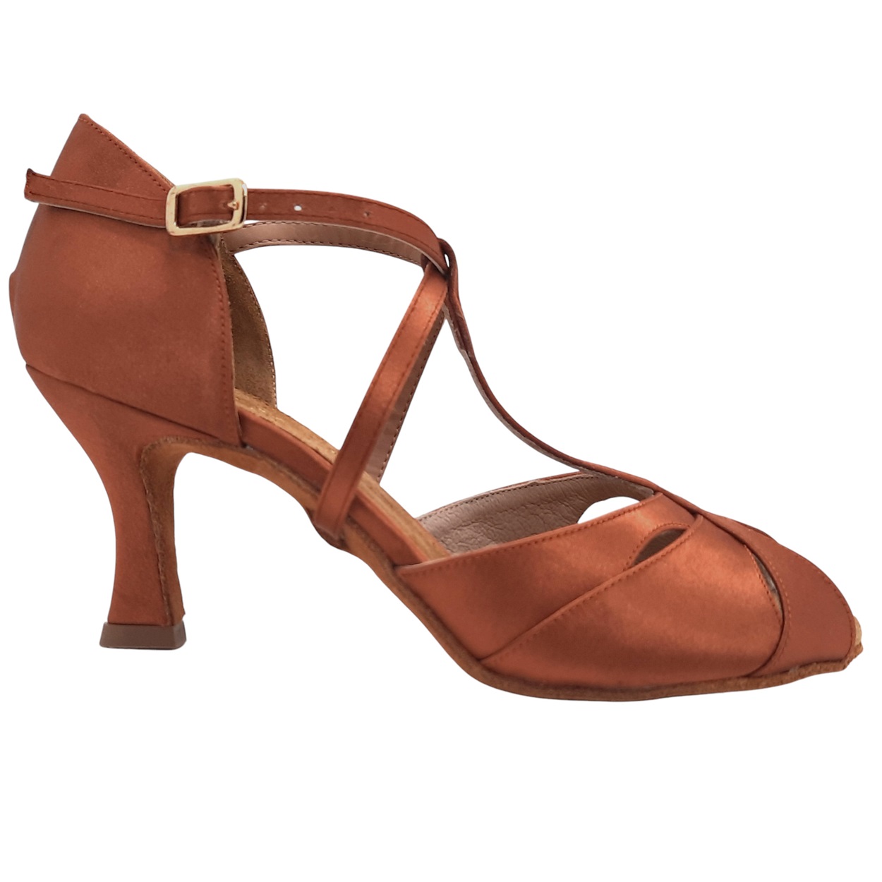 Eine neue Variante des beliebten Tanz Sandale Boca De Leone - hier ohne Tunnel an der Achilles-Sehne - und in einer nicht zu schmalen Form. Mit 70 mm Absatz in dunklerem kupfer Satin , sehr flexibel mit Wildleder-Innensohle und guter Polsterung.