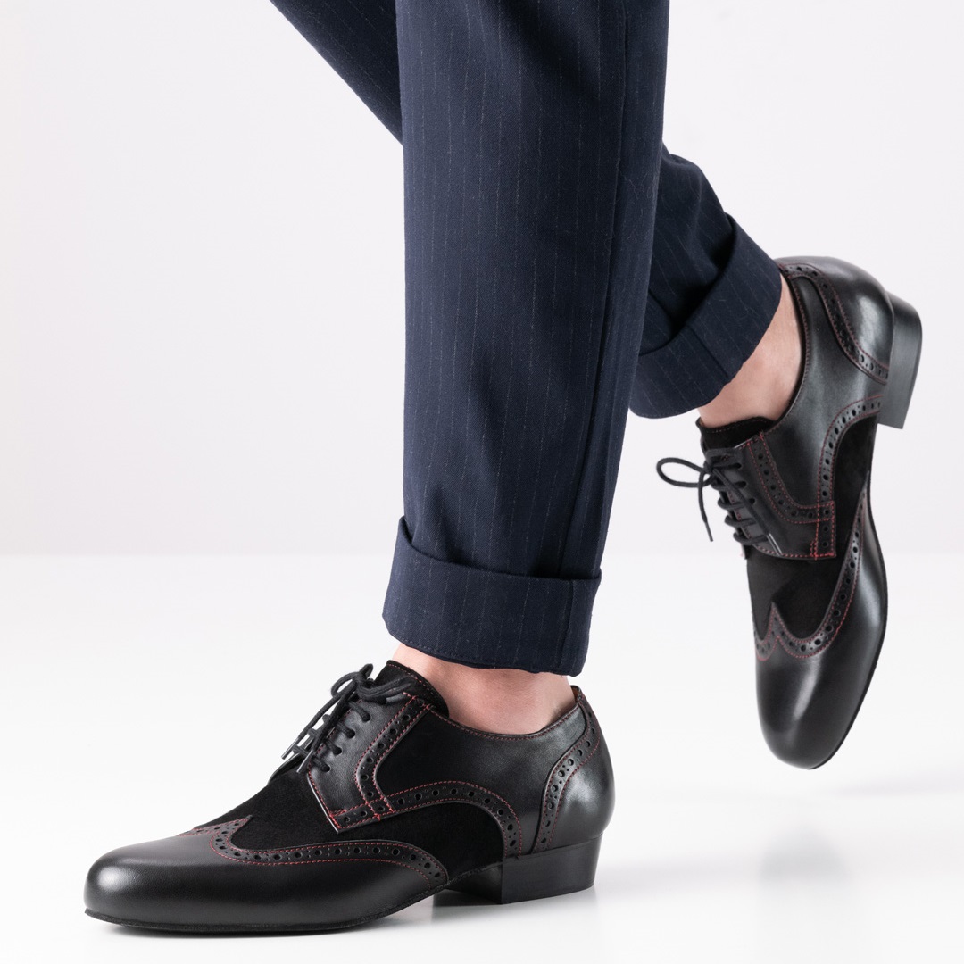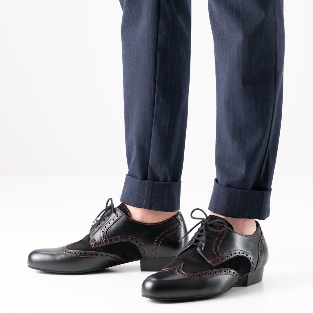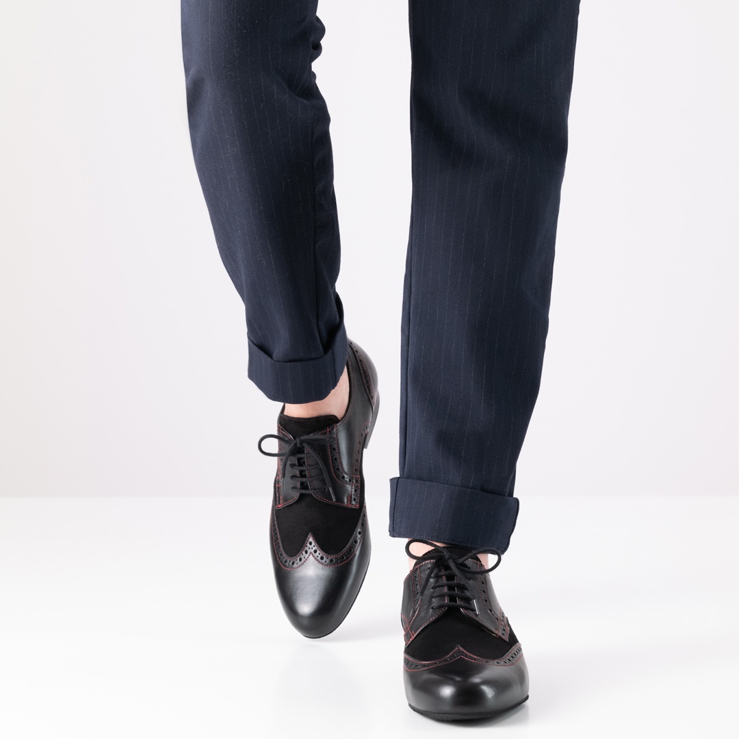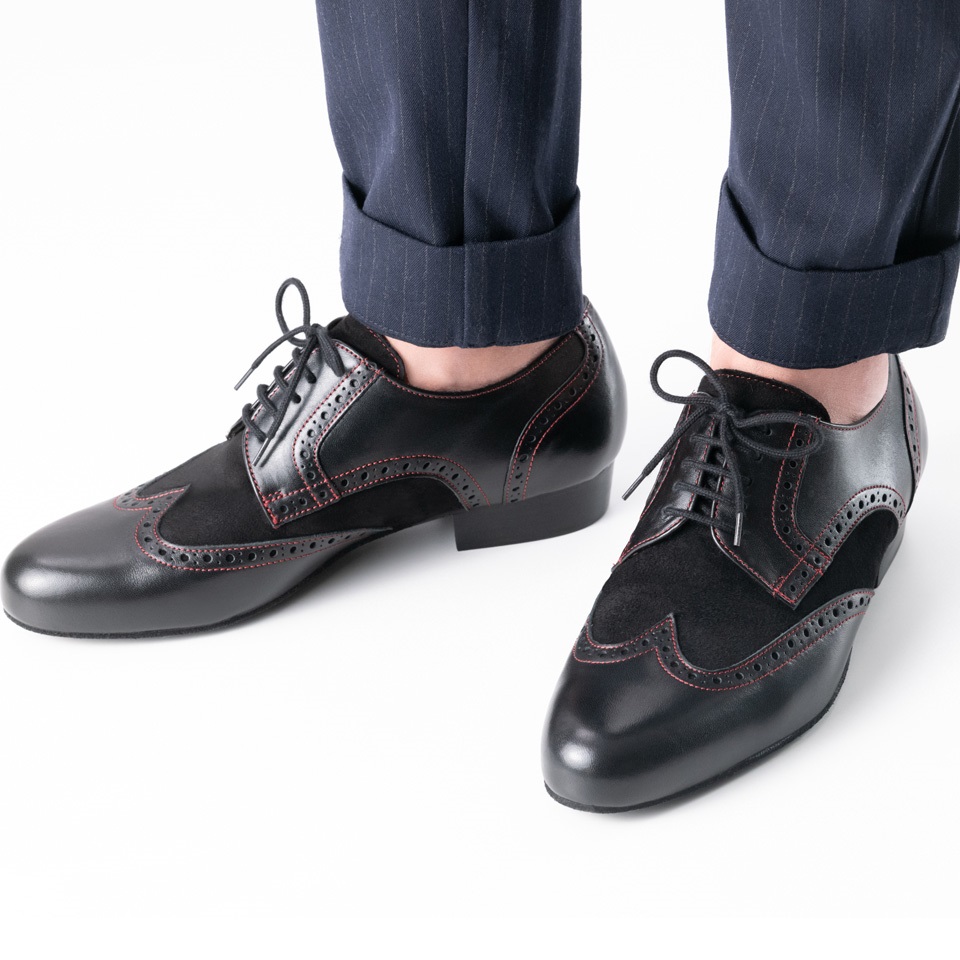 Trapani von Werner Kern – der eleganter Vollleder Herrentanzschuh für stilbewusste Tänzer. Dieses Modell vereint schwarzes Nappaleder und weiches Velourleder zu einem unvergleichlich edlen Look. Die feinen roten Nähte und die klassischen Brogue-Details verleihen Trapani eine raffinierte Note, die jeden Ihrer Tanzschritte unterstreicht. Der leicht erhöhte und abgeschrägte Absatz gibt dem Fuß zusätzlich einen bequemen Stand.