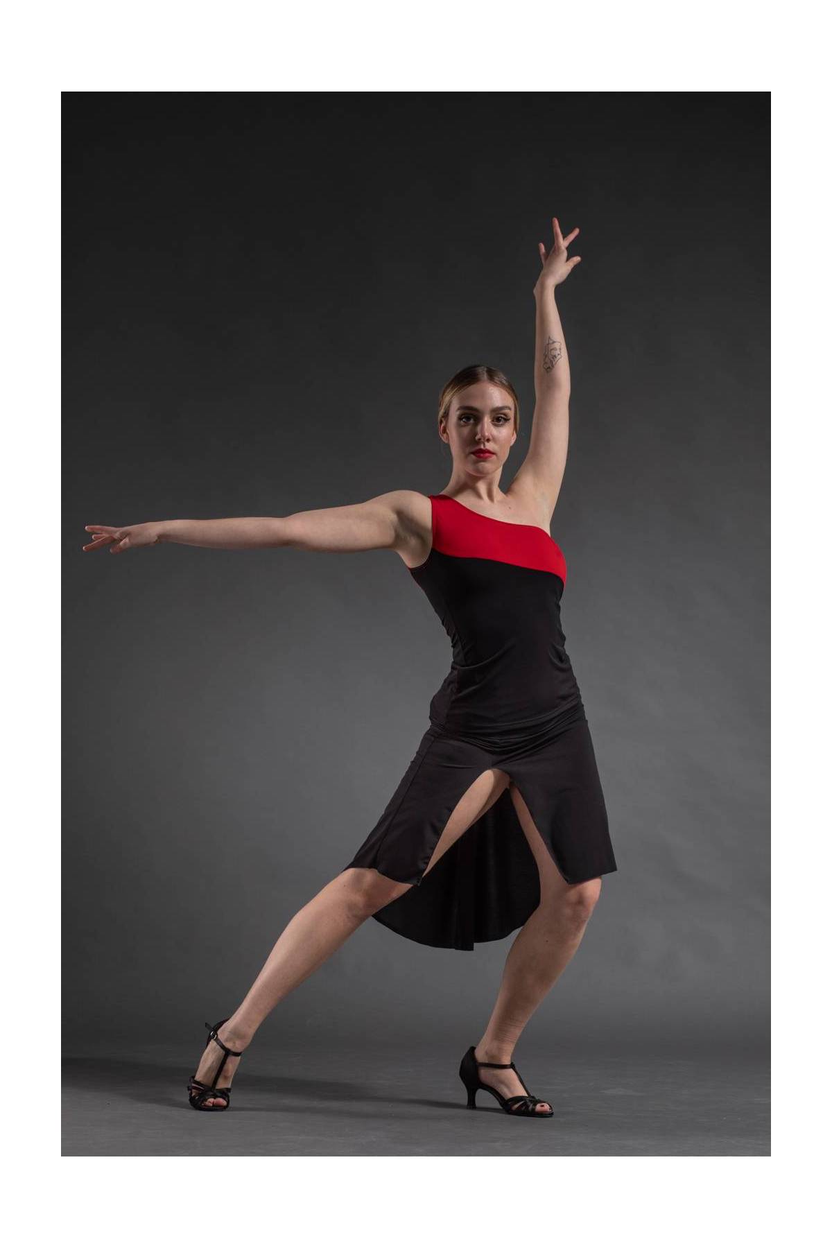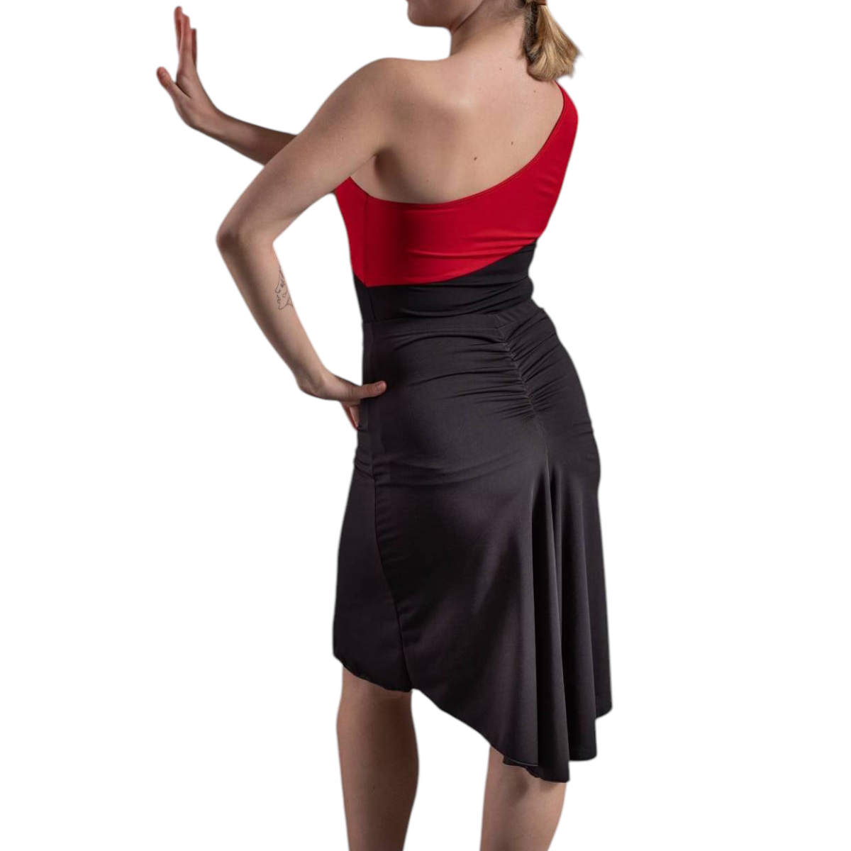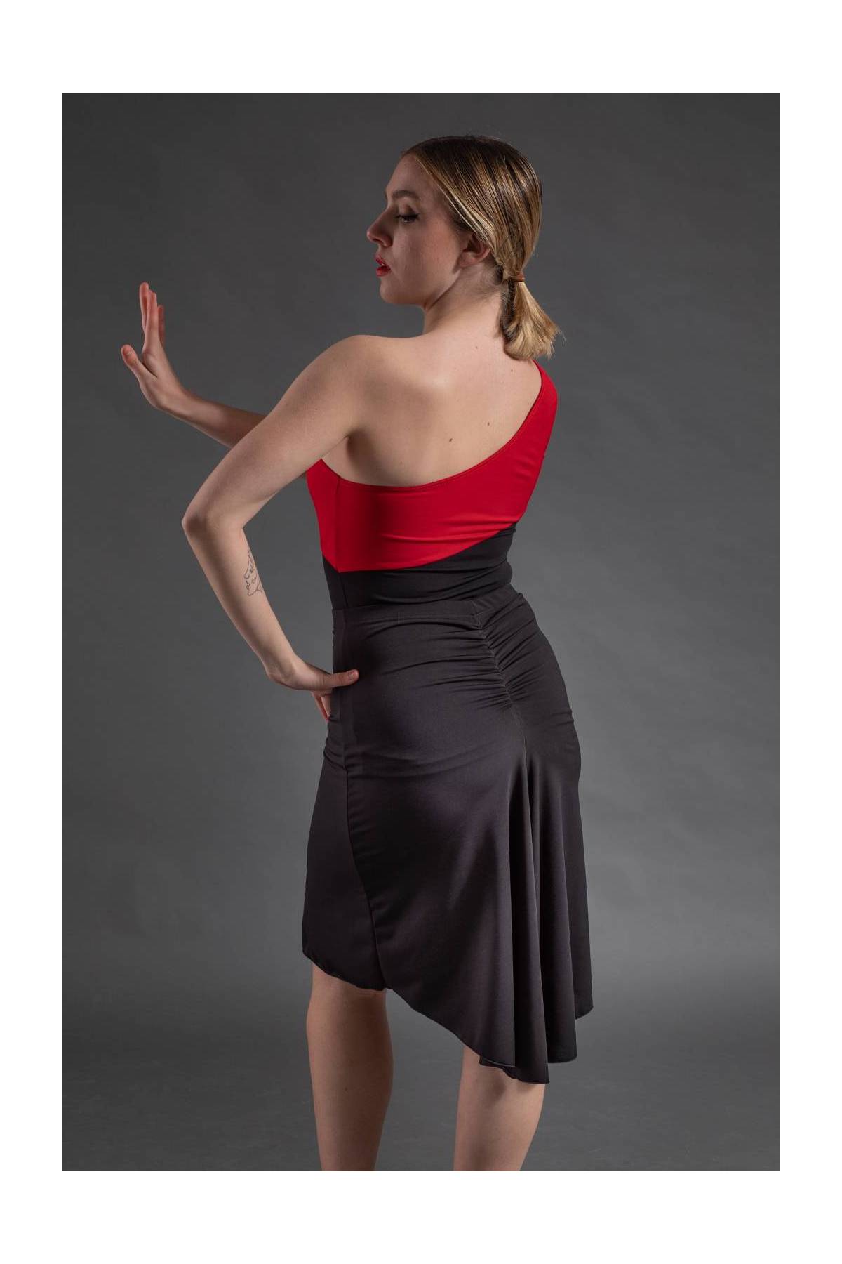 Raffinierter Rock für Latein, Tango Argentino oder Salsa mit Schlitz auf rechtem Bein, darüber eine Raffung die gleichzeitig ein wenig kaschiert. Raffung auch über dem Po - sowie eine schwingende Godetfalte