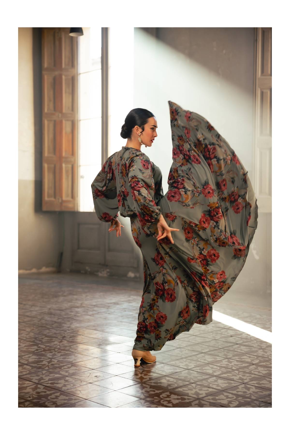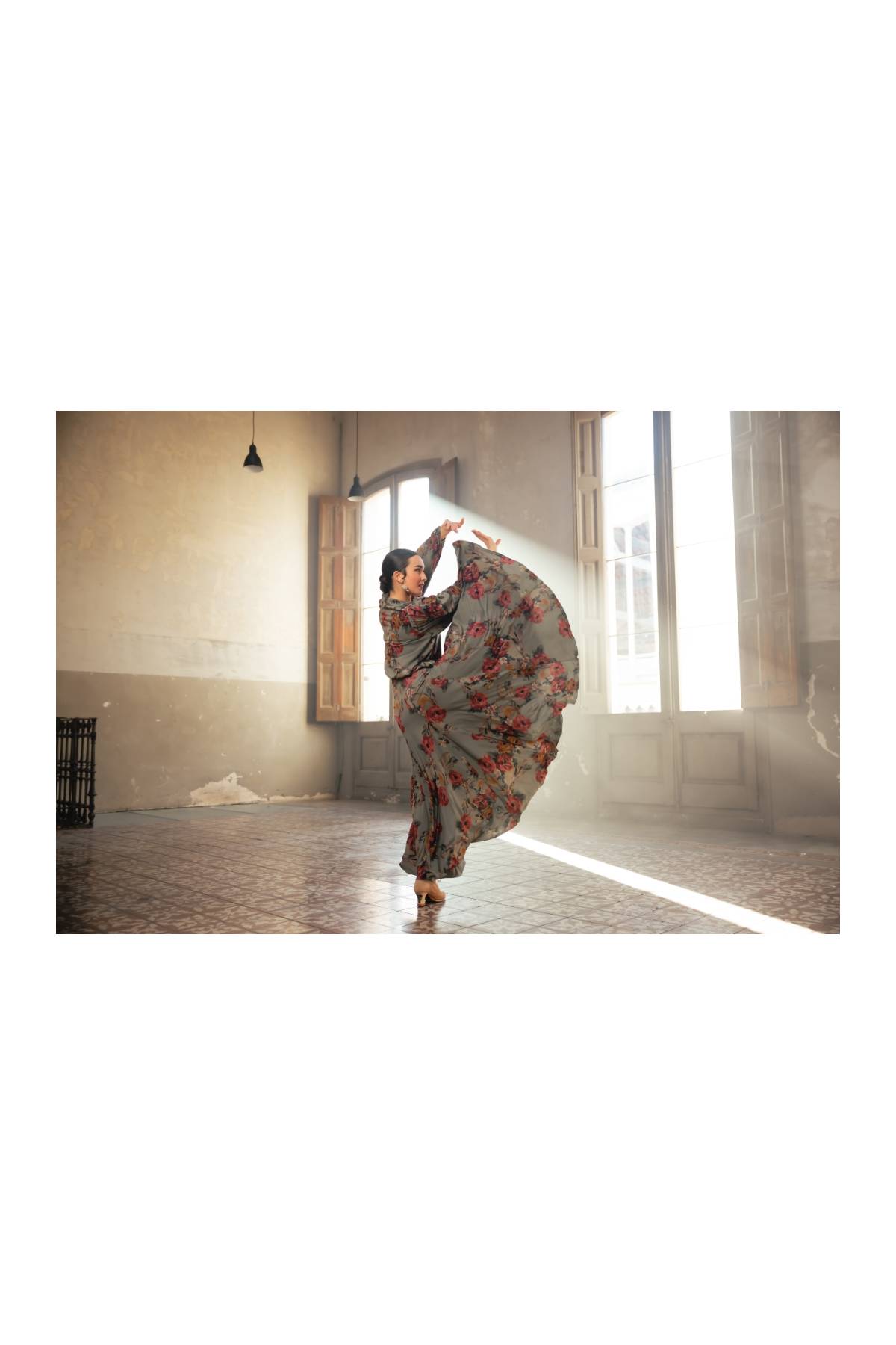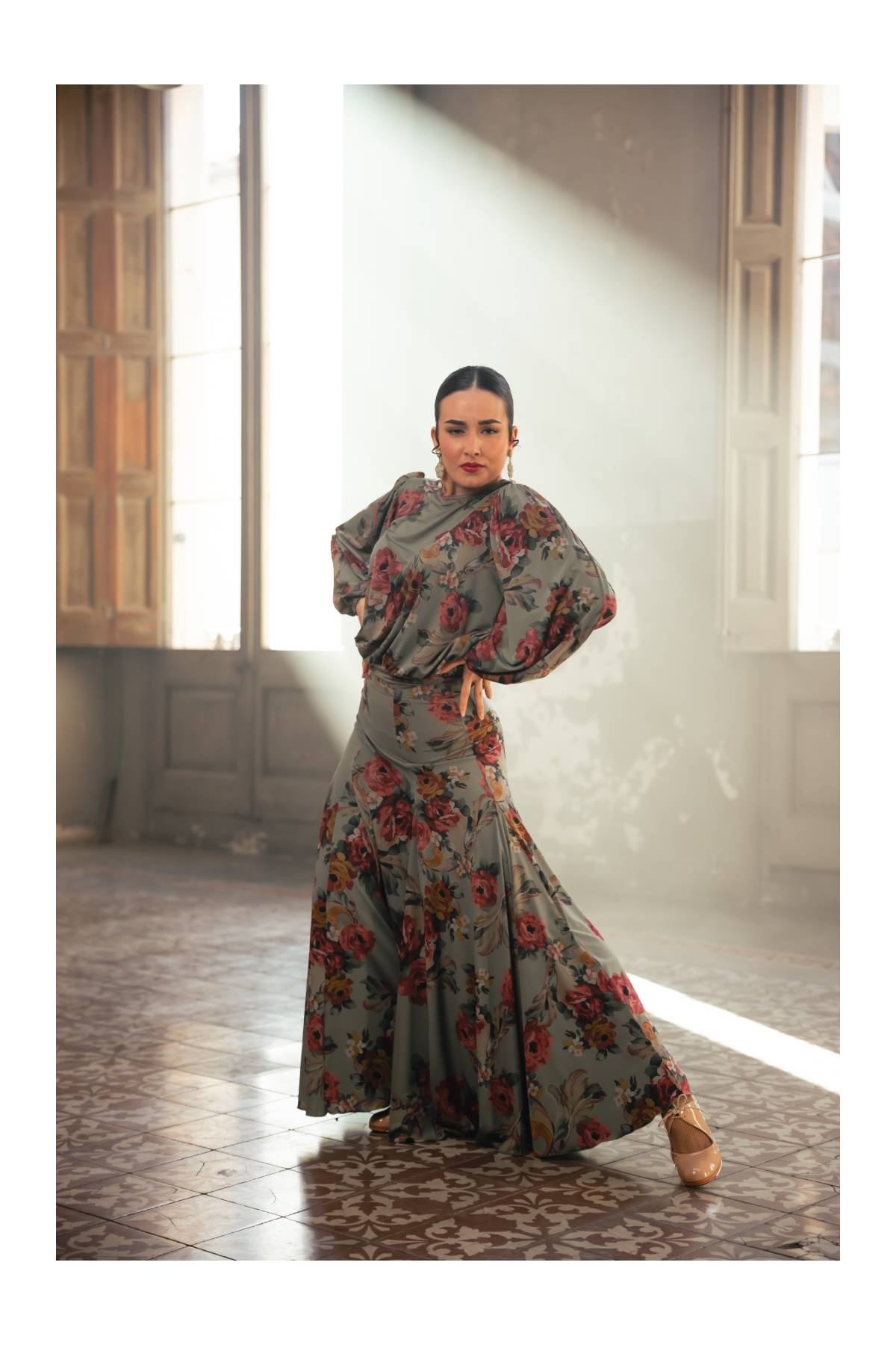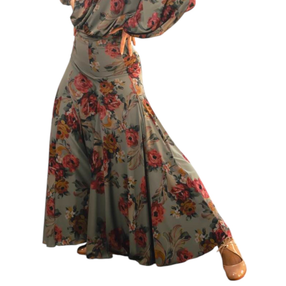 Weit schwingender Rock mit elastischem Bund für Flamenco, - hier in einem besonderen Print von granat-farbenen Blumen auf hellgrünem Untergrund. Riesenfülle für eine gute Bewegung durch 6 Bahnen mit 6 eingesetzten Keilen, handgefertigt in Spanien - dieser Rock eignet sich auch super als extravaganter Standard Tanzrock für Ballroom für sehr große Frauen, da er eine tolle Länge mitbringt und schwer fällt - dadurch schwingt er besonders gut.
