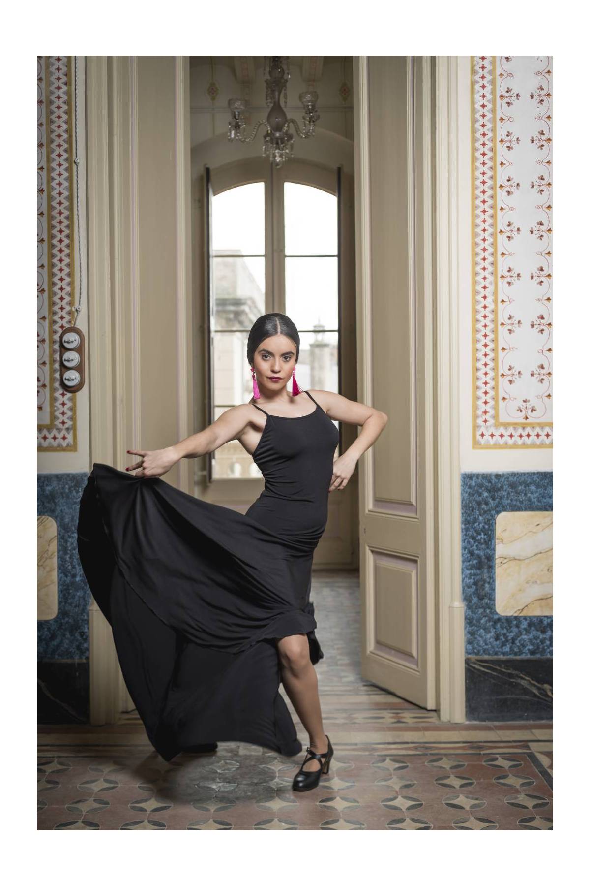 Langes Kleid mit Trägern und 2 Godets an jeder Seite und auf dem Rücken. Perfekt für Flamenco aber auch ein super Rohling für Standard Turnier da die Rockweite stimmt und der schwere Stoff schön fliegt und jede Bewegung von Dir mit Schwung begleitet. Mit einem tollen halb transparenten Überkleid (siehe Fotos) kannst Du daraus ein edles Outfit für Dein Show Off kreieren.