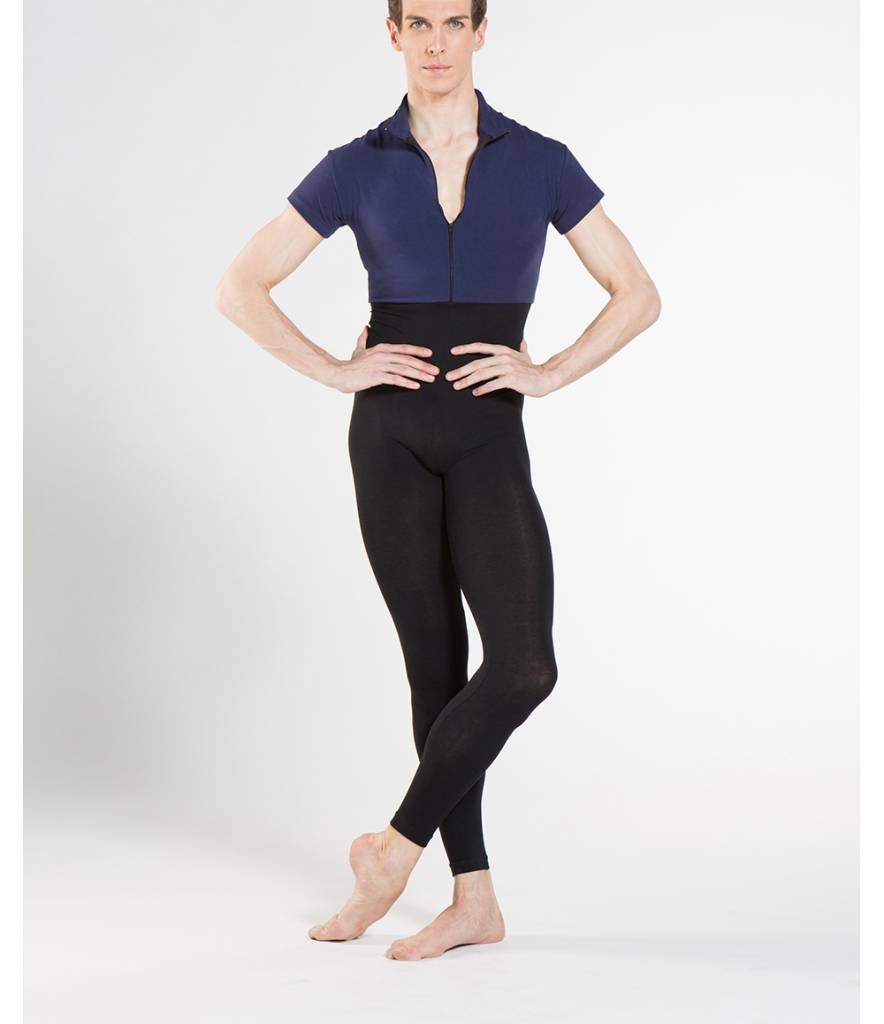 Hochwertiger zweifarbiger Herren Ganzanzug ohne Fuss mit Reissverschluss vorne und kleinem weichen Stehkragen, 91% Baumwolle/ 9% Elasthan -  in weiss-grau oder marine-schwarz aus der Herren Ballett Kollektion von Wear Moi