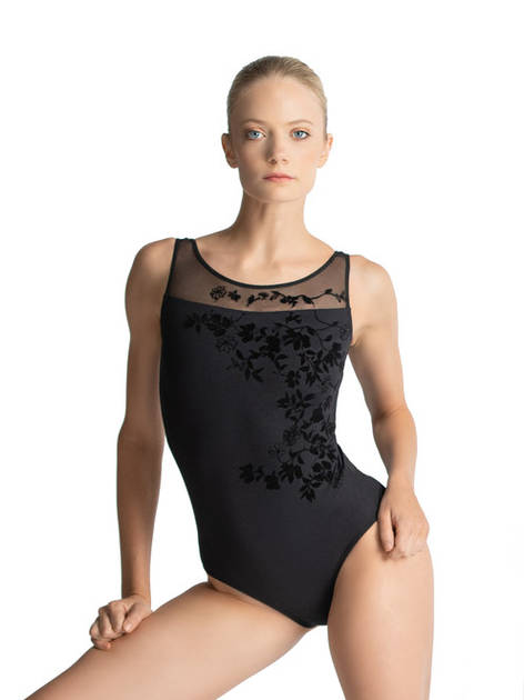 Ballettanzug mit Tankträgern von BALLET ROSA - Italienische Mikrofaser trifft Flockprint im Blumendekor - ein gelungenes Trikot, edel und sportlich vereint - superbequem mit feinem Mesh überlegt, mit schwarzen Blumen beflockt - Romantik pur auf einem Ballettanzug, der auch das härteste Work-Out mitmacht. Subtile Eleganz in uni schwarz
