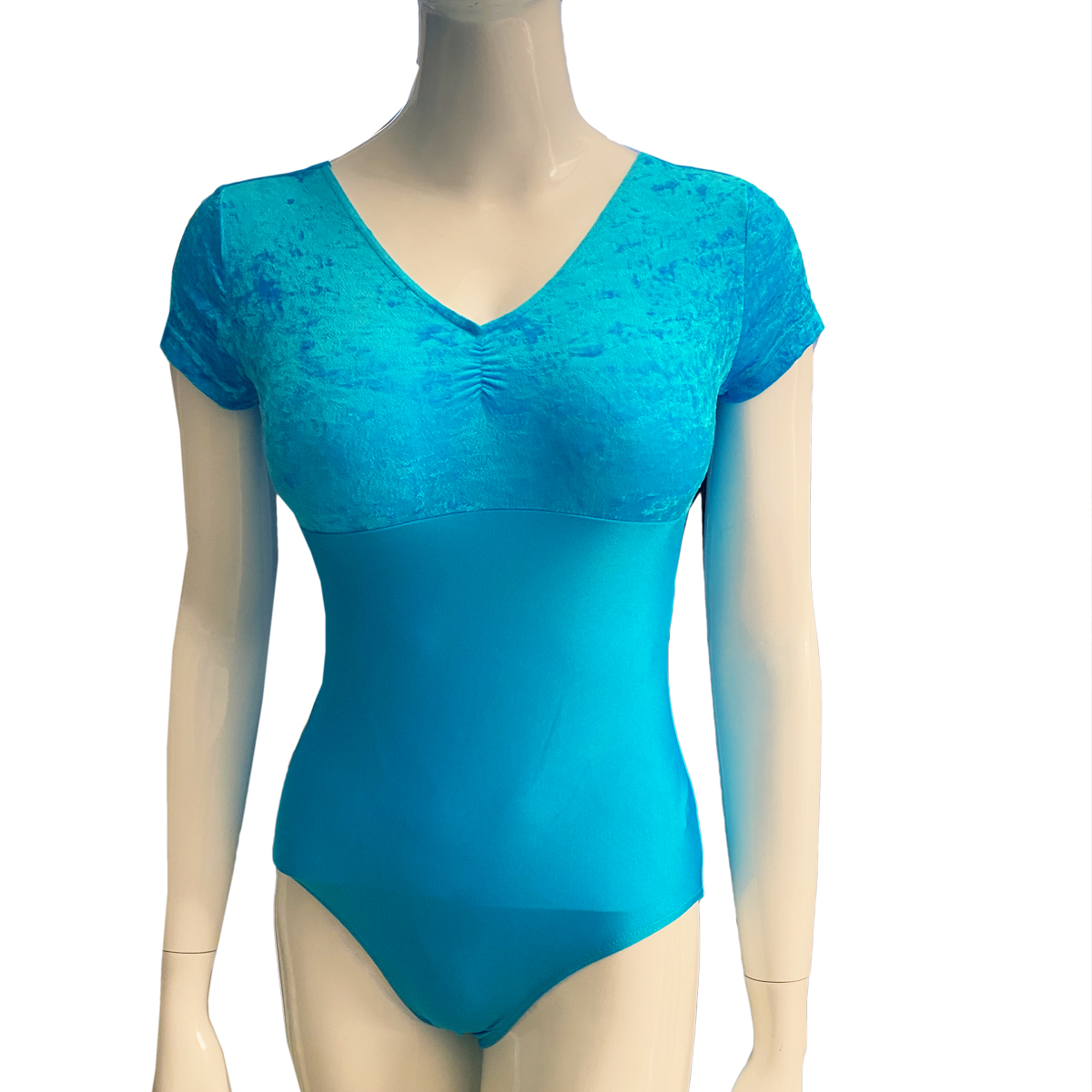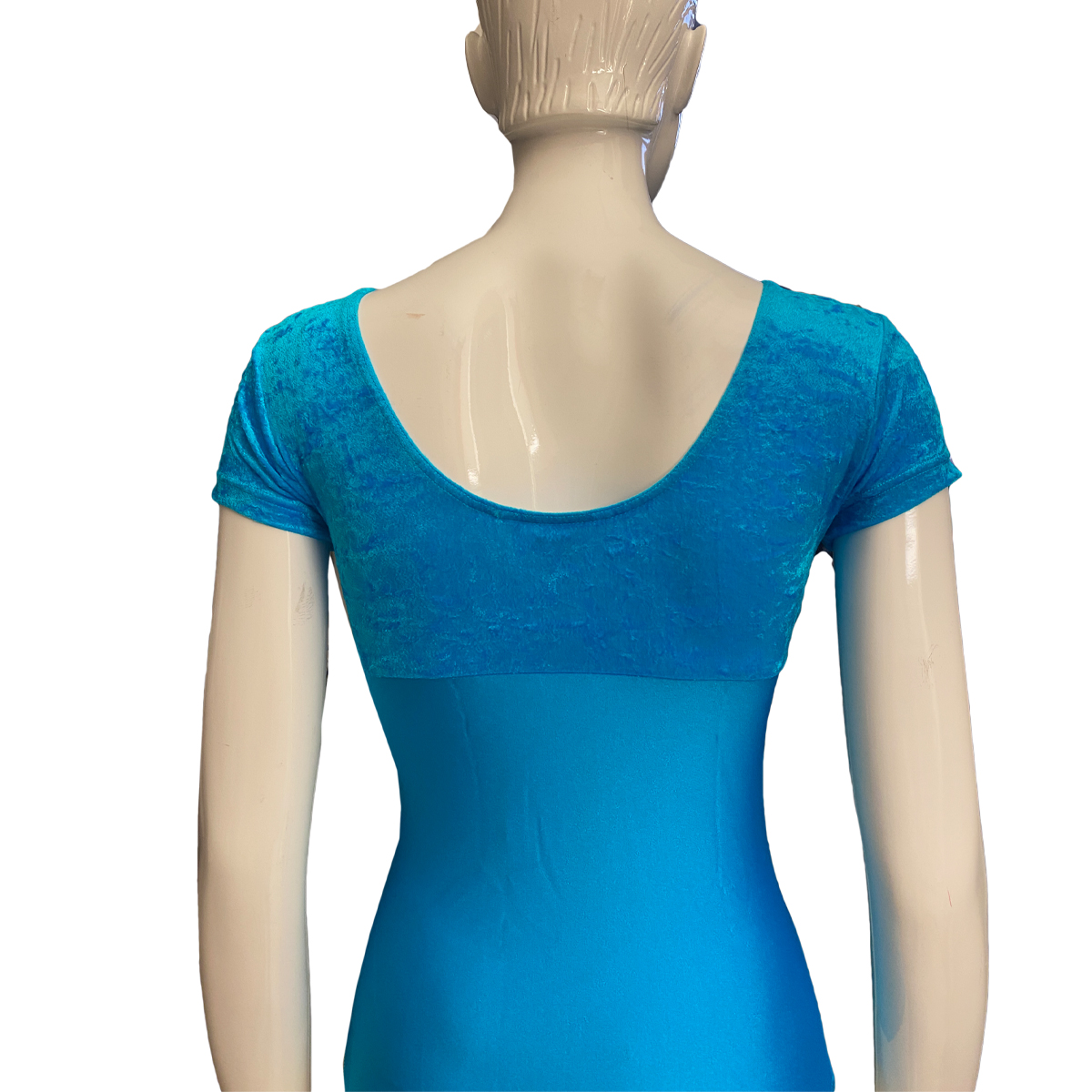 Kurzarm Ballett- / Turntrikot in Türkisblau mit Bustier in weichem Samt und unterhalb der Büste Glanzlycra. Perfekt für die Bühne - diese Farbe sieht man nicht so oft.
