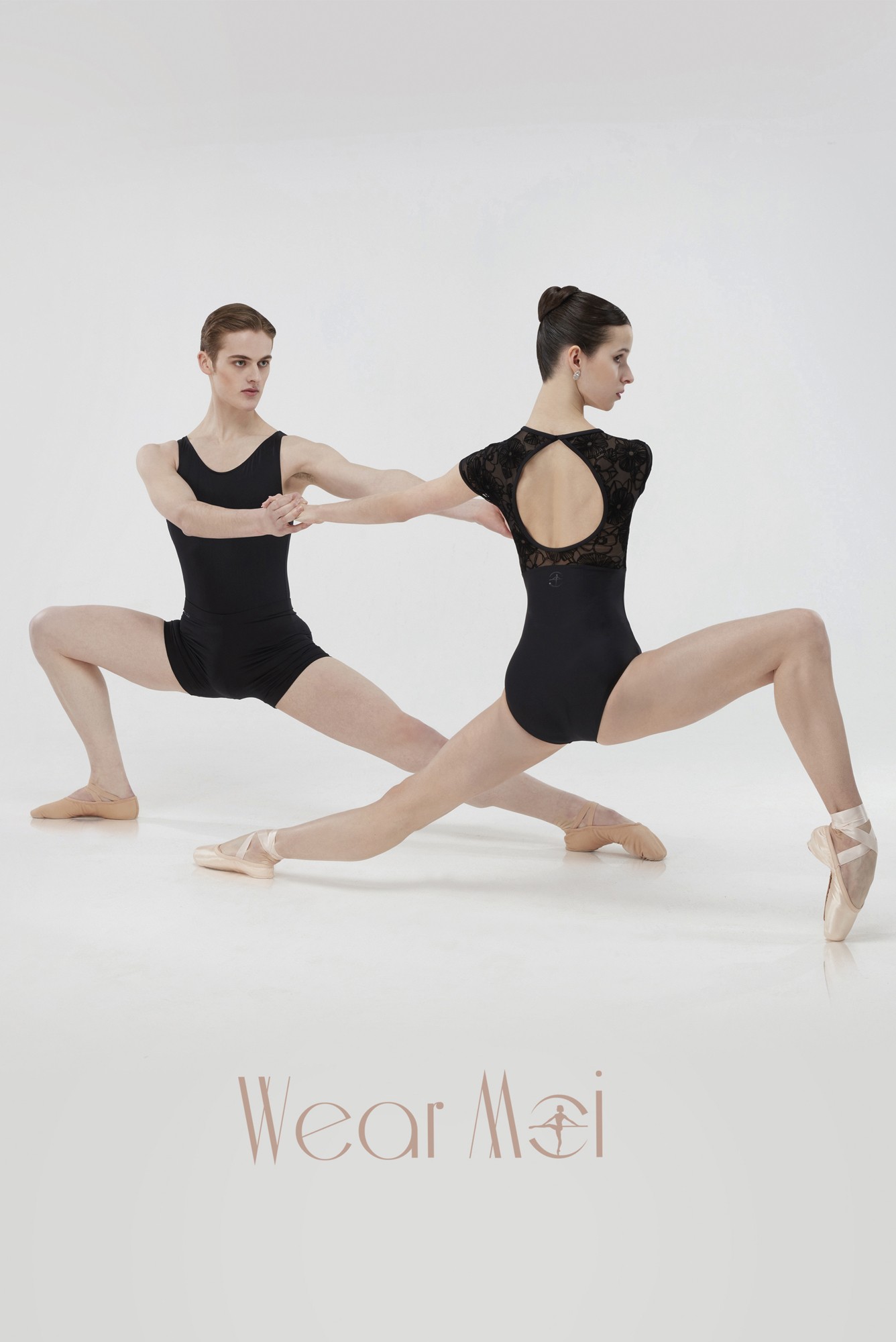 Wunderschöner Kurzarm Ballettanzug von WEAR MOI aus Frankreich mit einem Oberteil aus Ausbrenner Mesh mit Schlüsselloch-Ausschnitt vorn und hinten mit stoffbezogenem Verschlussknopf im Nacken.