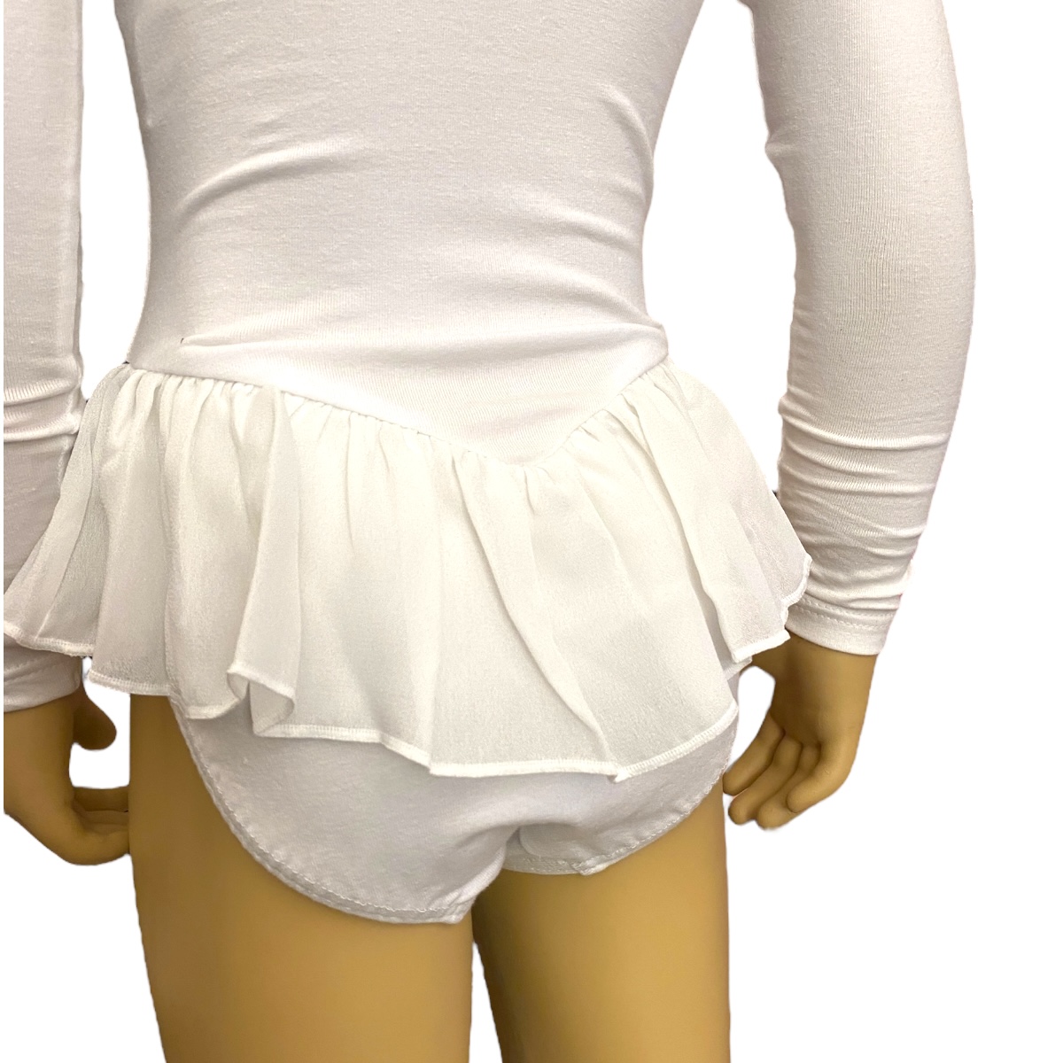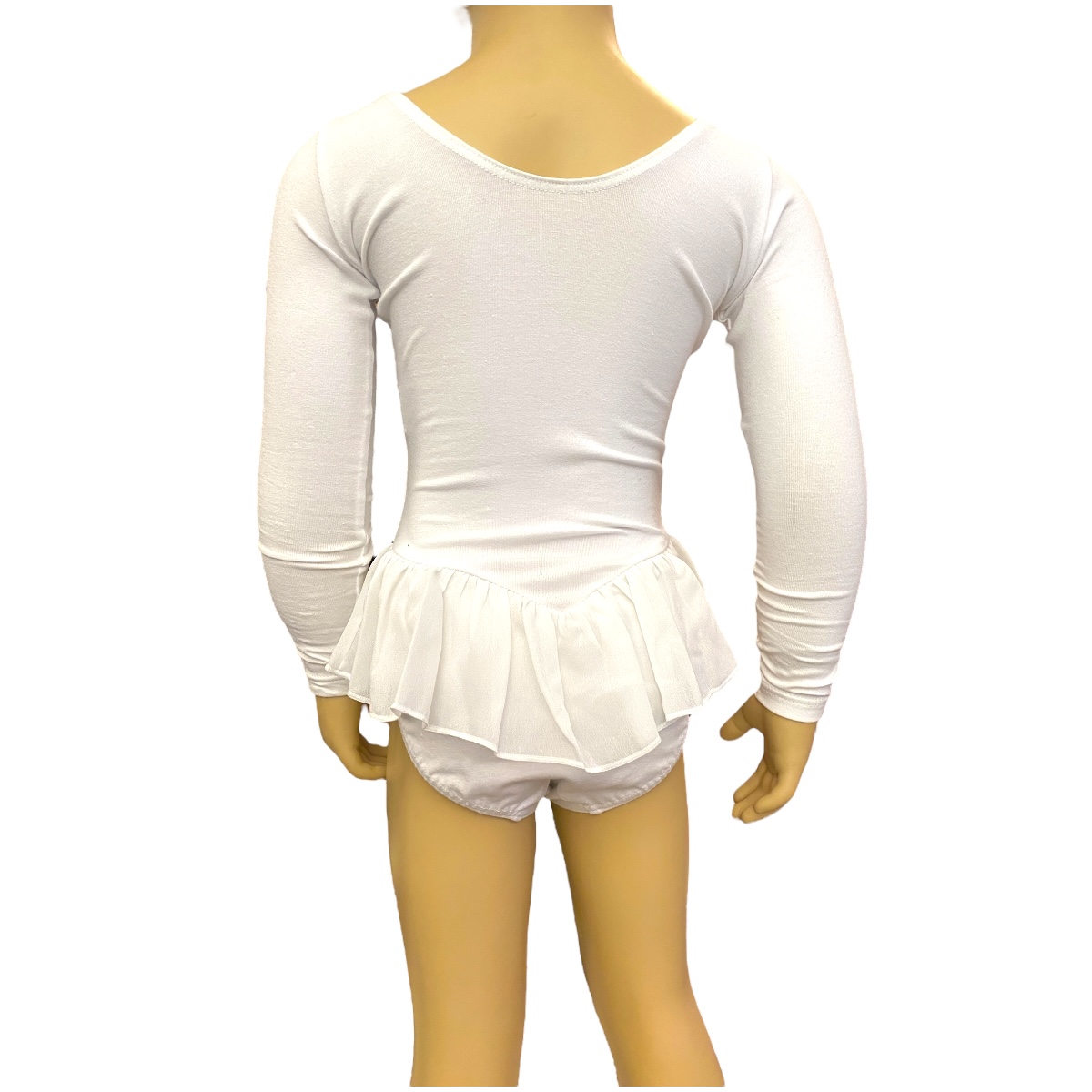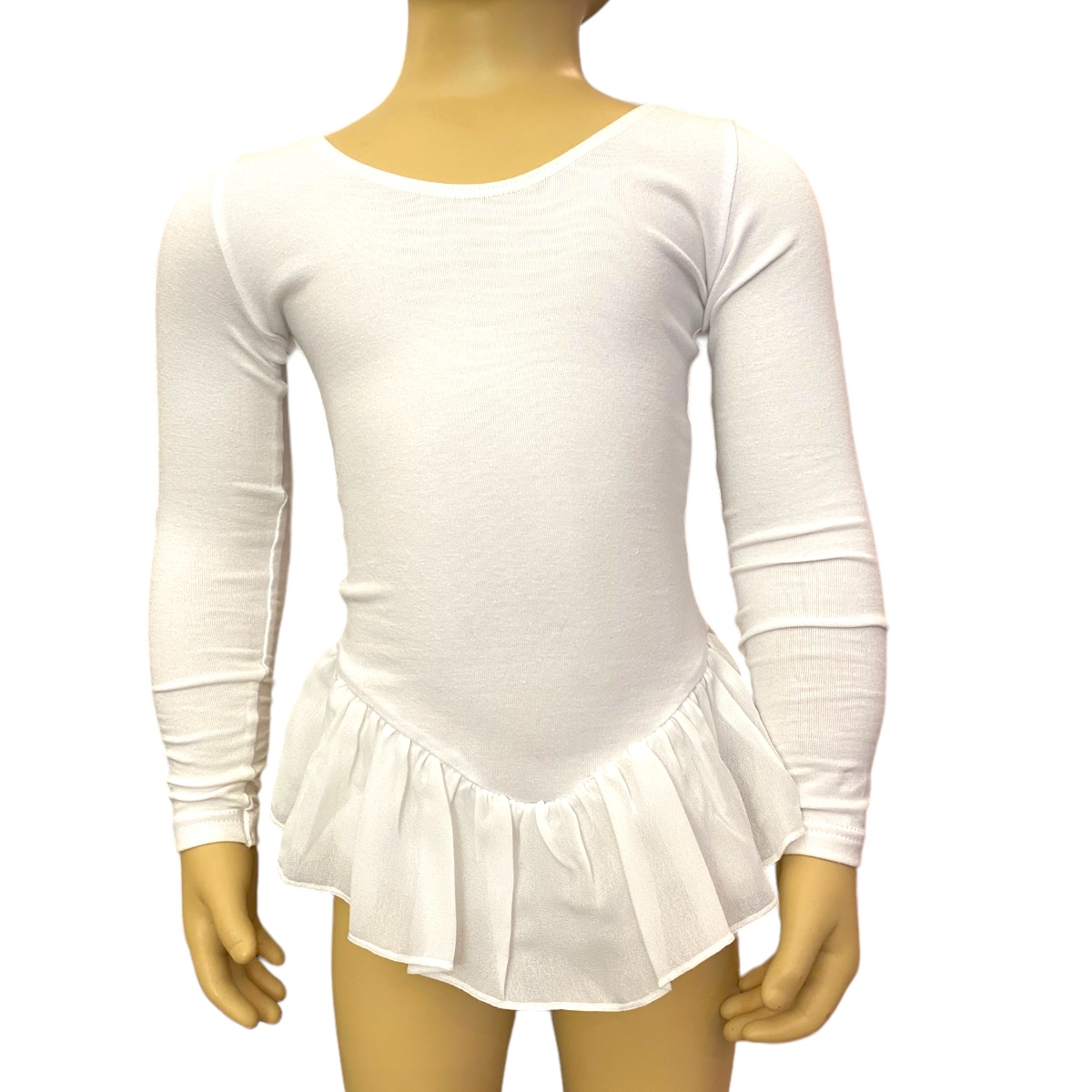 Baumwoll-Ballettkleidchen mit hoch angesetzter Rüsche/Röckchen zur guten Sicht auf die Beinchen der kleinen Ballerina. In Deutschland gefertigt, aus Baumwolle mit langem Arm. Perfekt für den akademischen aber auch spielerischen Unterricht.