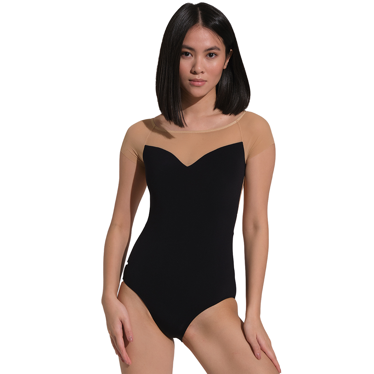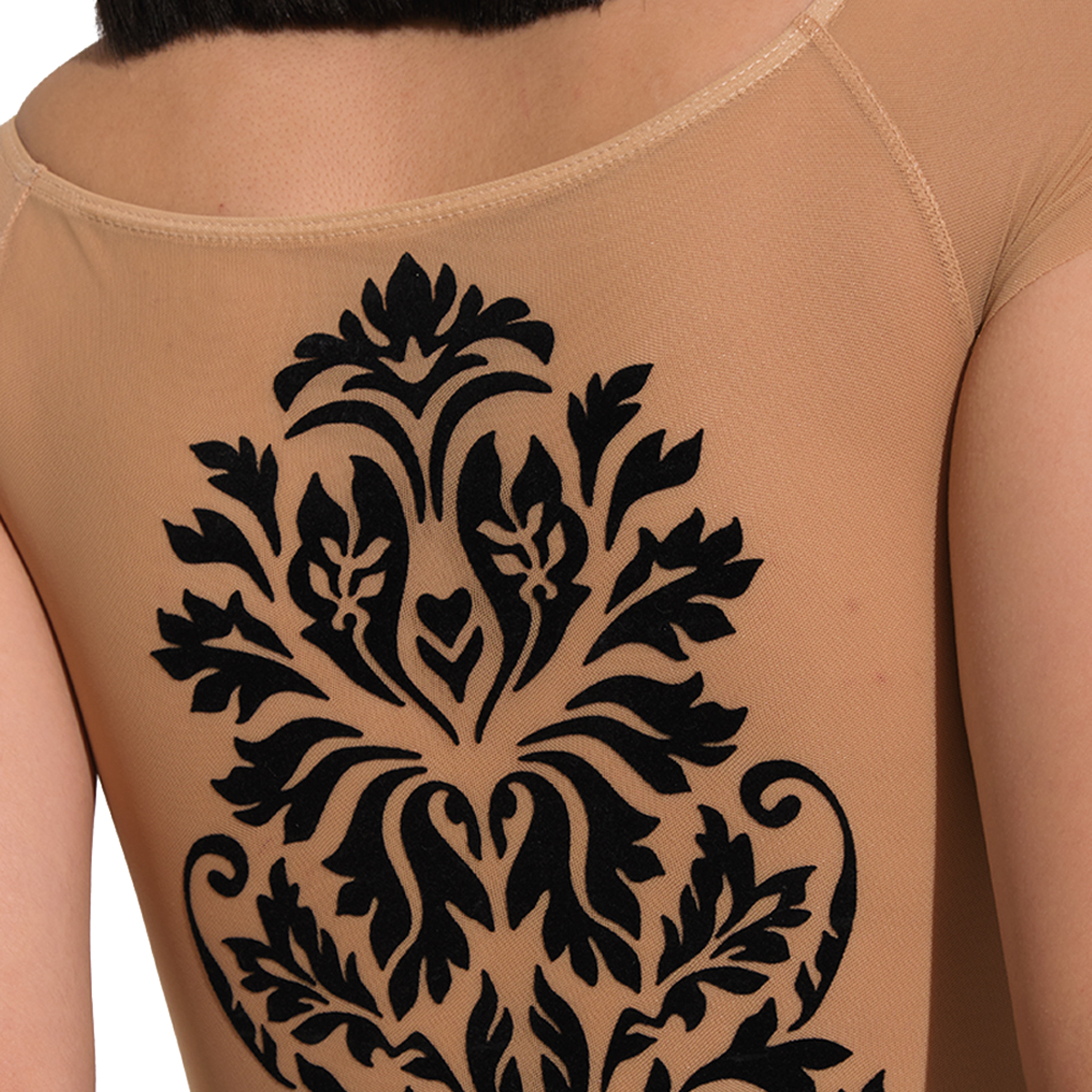 Wunderbares, beflocktes Mesh-Design mit niedrigem Rücken und Sweetheart-Ausschnitt. Zarte Flügelärmel, und bedrucktes weiches Mesh, dass die Illusion eines Tattoo-Rückens erzeugt. Bequeme, nicht eingefasste Ärmel.