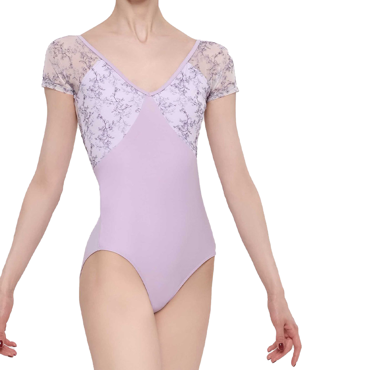 Dieses kurzärmlige Trikot hat eine schöne V-Form vorne und hinten. Eine kreuzweise eingelegte transparente Tüllbahn erzeugt einen edlen Eindruck. Die Vorderseite, die Rückseiten der Ärmel, der untere Einsatz und die Unterseite des Trikots sind aus einfarbiger Elastan-Mikrofaser. Bestickter Tüll ist über der Mikrofaser auf der Brust geschichtet und wird allein verwendet, um einen transparenten Effekt auf den Vorderseiten der Ärmel zu erzielen.