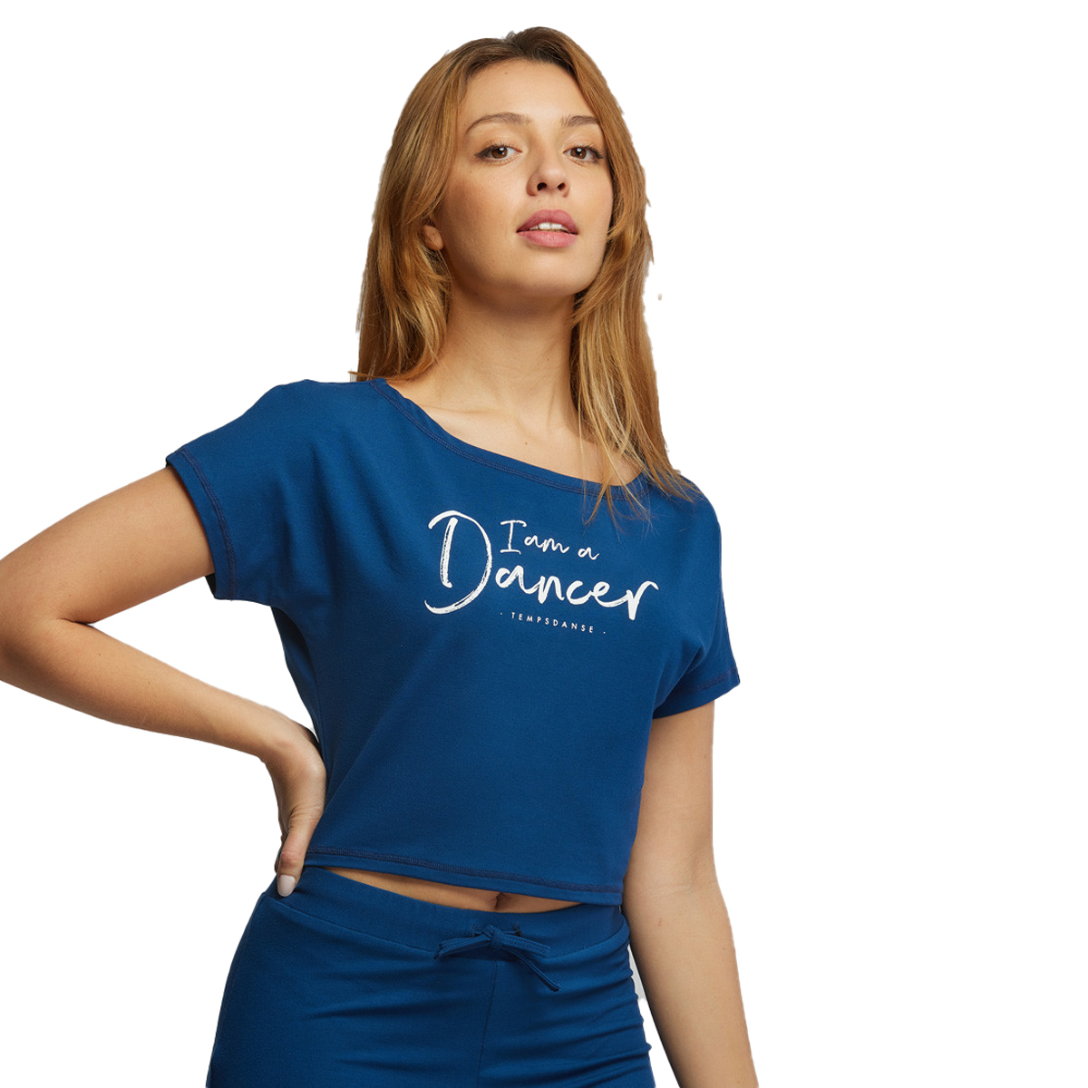 Das Crop Top Agile mit der Aufschrift "I am a dancer" aus dem Hause TempsDanse mit lockerem Schnitt und am Rücken etwas länger.