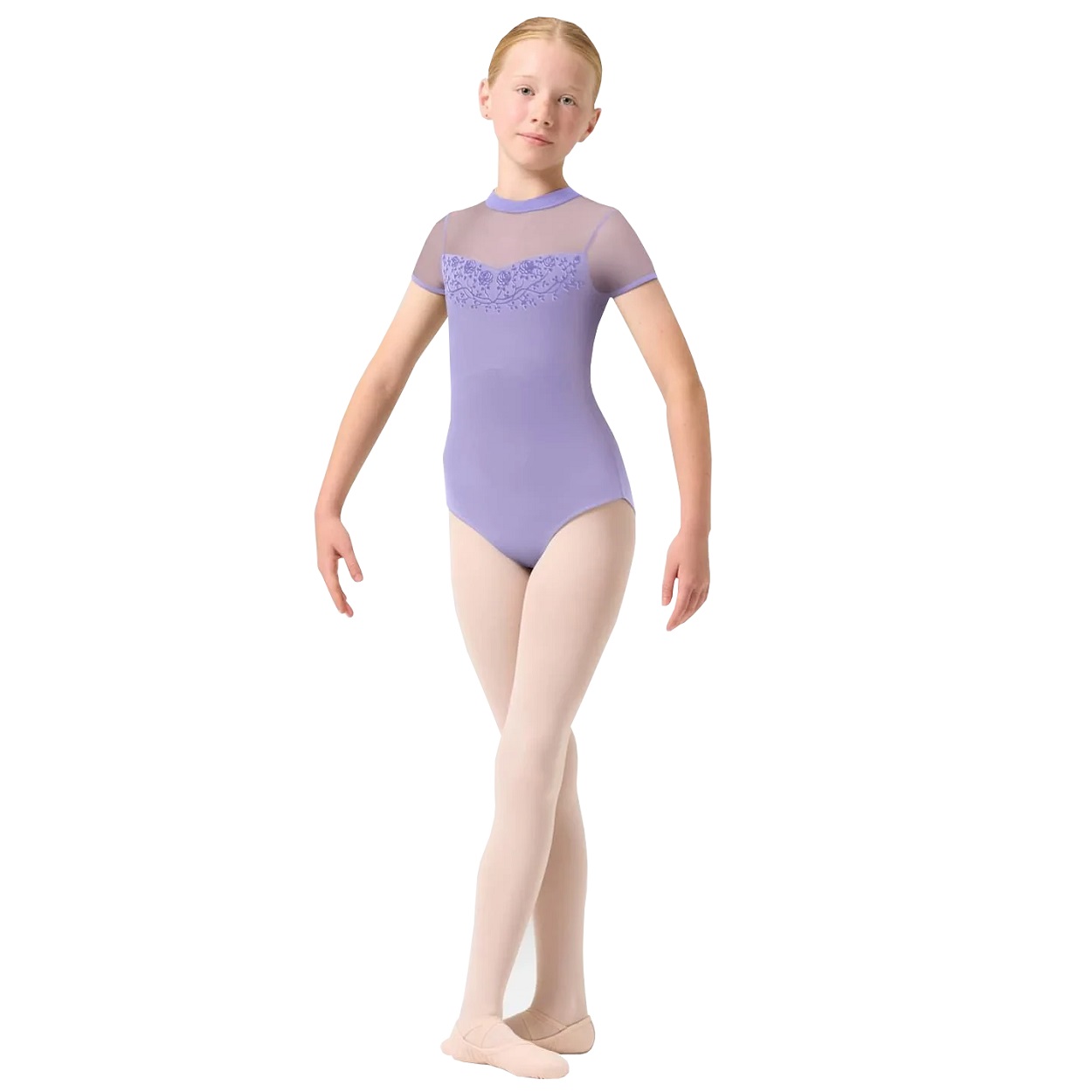 Das Trikot mit Flügelärmeln Esmey für Mädchen verfügt über einen hohen Halsausschnitt mit Netzärmeln und Schlüssellochdetail auf der Rückseite. Teil der Bloch Rose Vine-Kollektion für Mädchen mit exquisiten geflockten Blumendetails und zarten Netzeinsätzen.