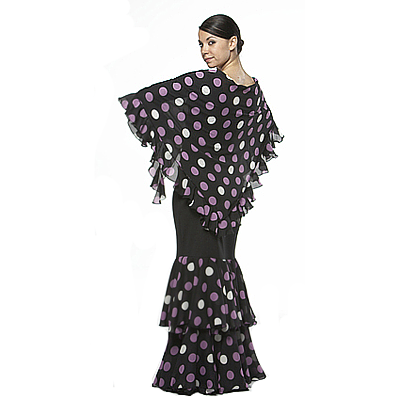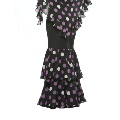 Der außergewöhnliche Flamencorock in der Farbe schwarz mit Volantabschlüssen aus weißen und lila Punkten. Von der Hüfte bis zu den Volantanfängen ist dieses Modell körperbetont geschnitten. Passend zum Trikot aus dem Hause Interezzo und ebenfalls bei uns im Shop zu finden.