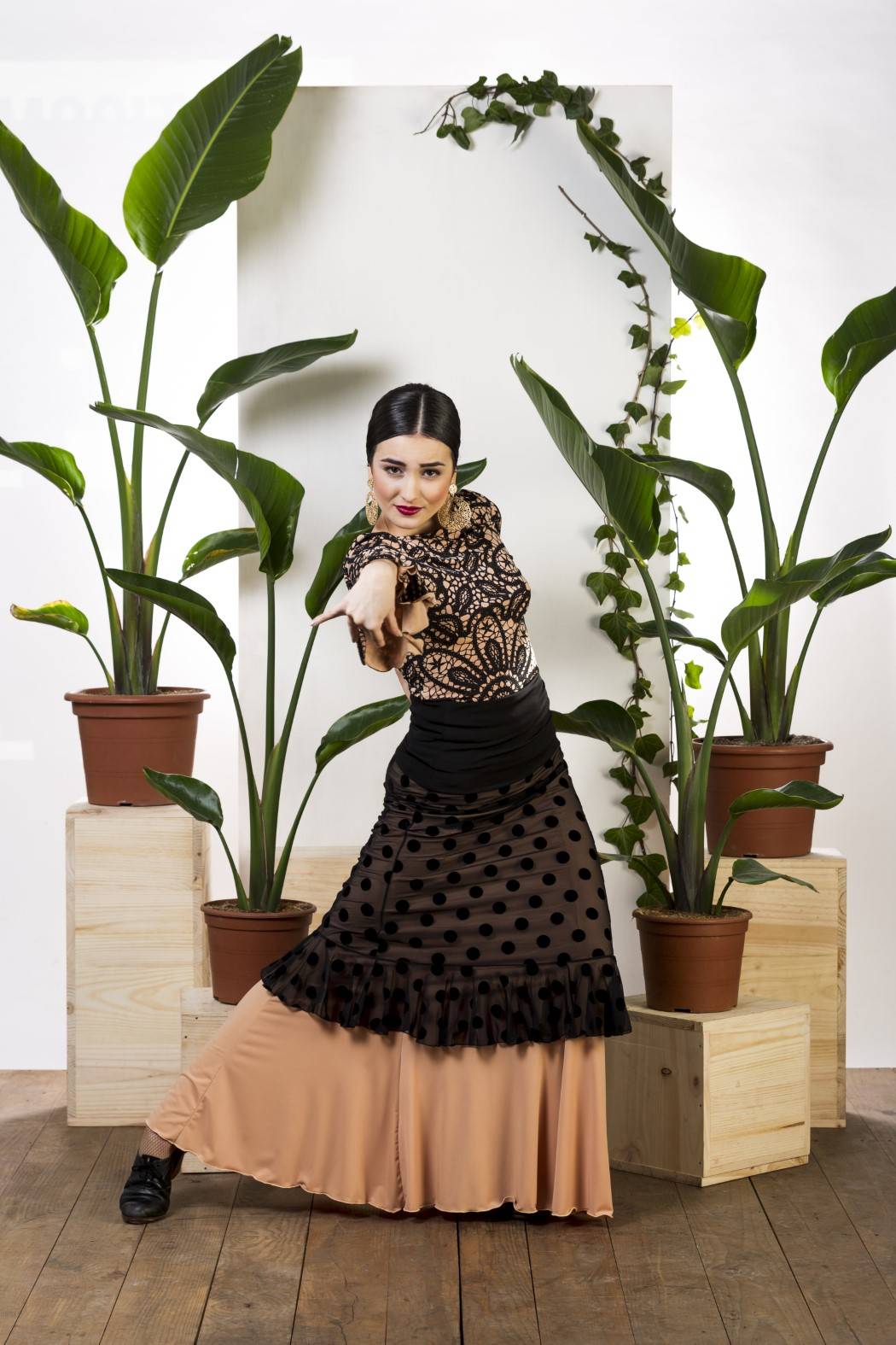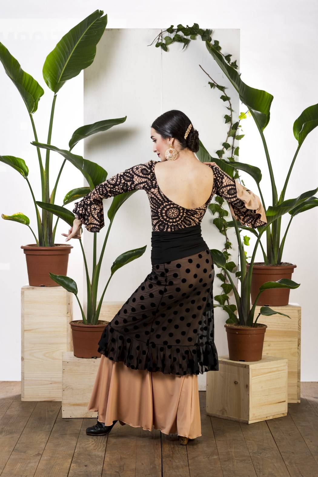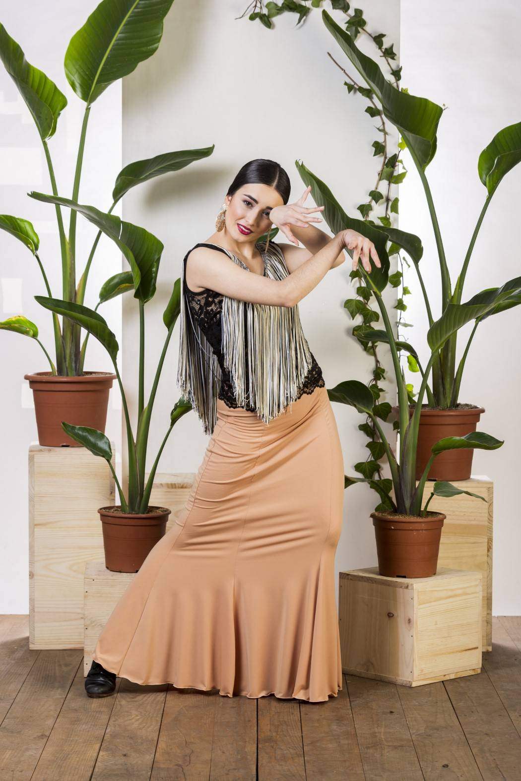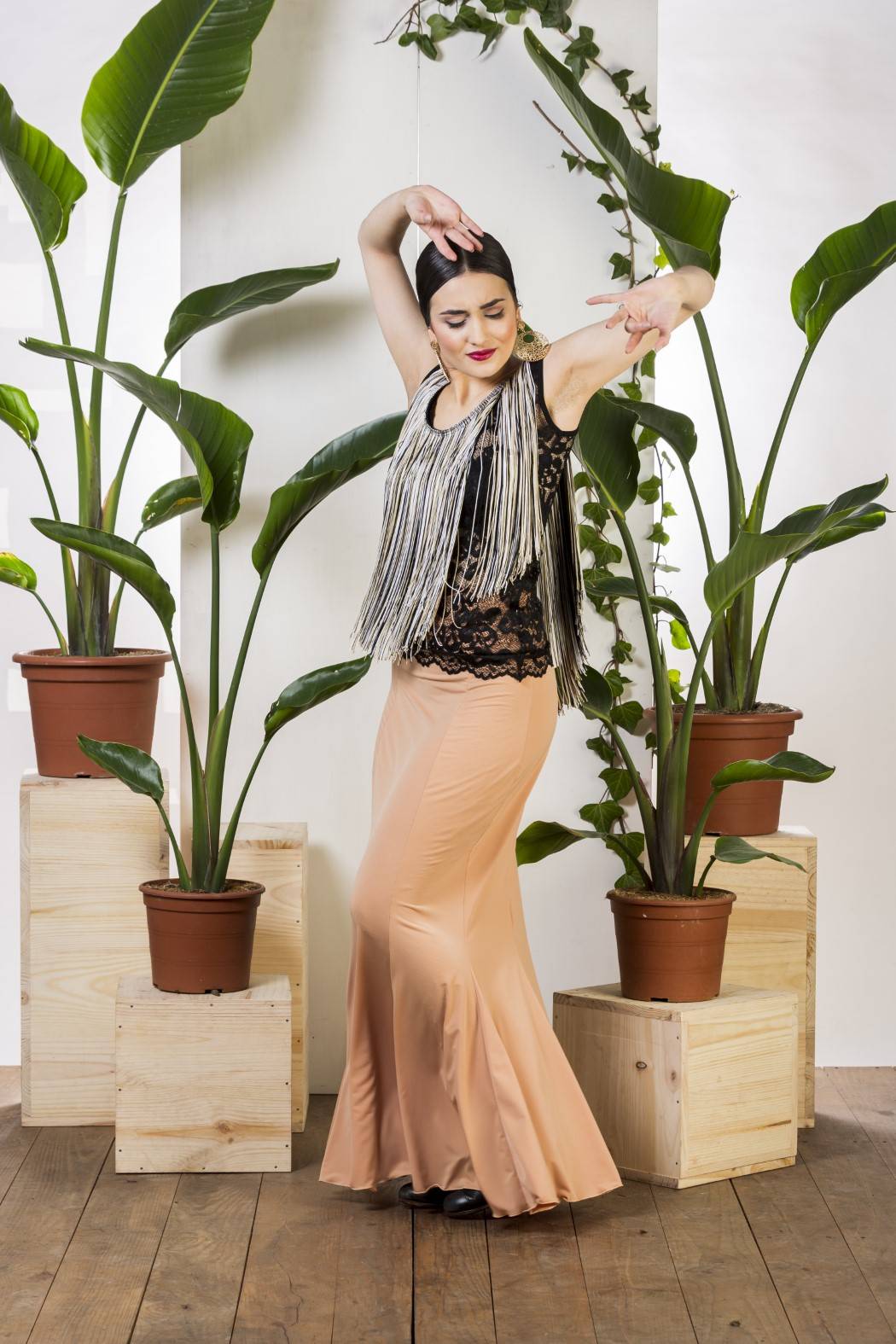 Rock mit toller Weite unten in der Farbe Mandel (beige) n beiden Seiten tragbar, die Ärmel ziert eine 13cm Rüsche. Der Stoff trägt sich weich und anschmiegsam - perfekt dazu auch der Rock Tajar (Artikel Nr. DAV-3997) in der Farbe Mandel, bzw, der Überrock Grazalema in schwarz (Art. DAV-3982)