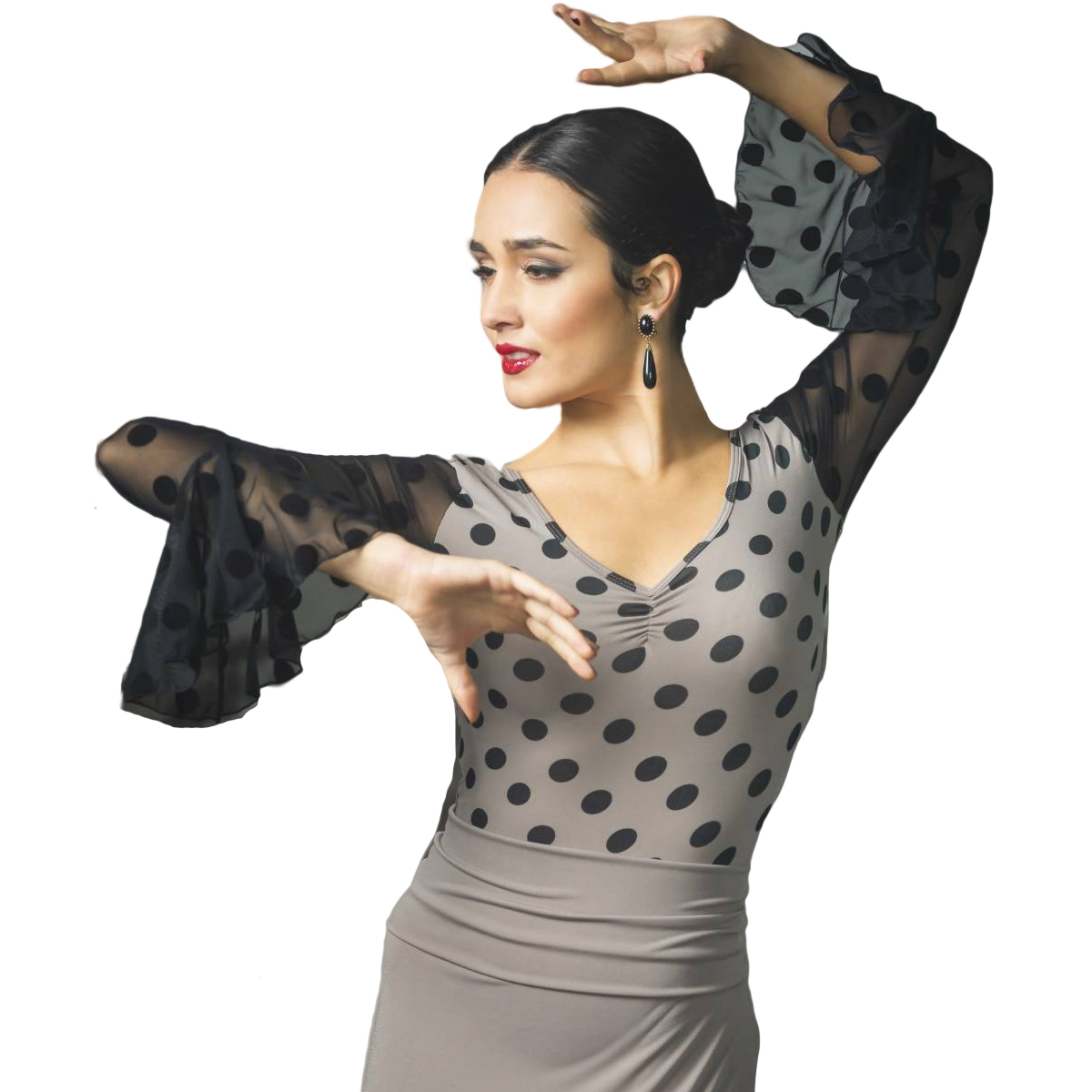 Body CAUTIN by DAVEDANS, Spanien - langärmliges Trikot mit Rüschen am Saum der Ärmel und rundem Ausschnitt, der vorne gerafft ist. Der Rücken hat einen runden Ausschnitt. Die für Spanien so typischen "Dots" elegant in einer neuen Farbkombi schwarz auf taupe. Ein Hingucker, besonders zusammen mit dem passenden Rock VALDIVIA, auch bei uns im Shop... limitierte Kollektion
